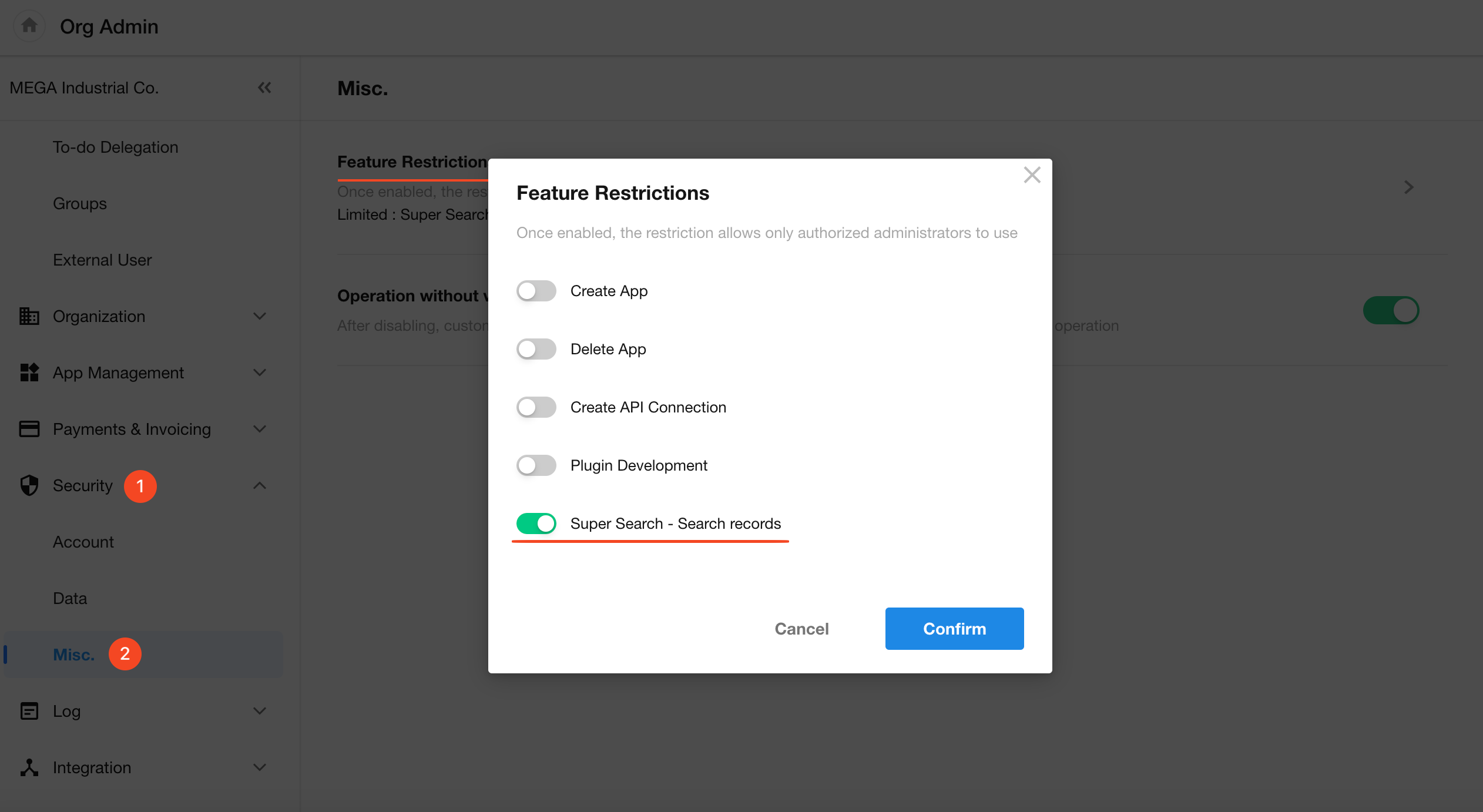 [Org Admin] > [Security] > [Misc.] > [Feature Restrictions]