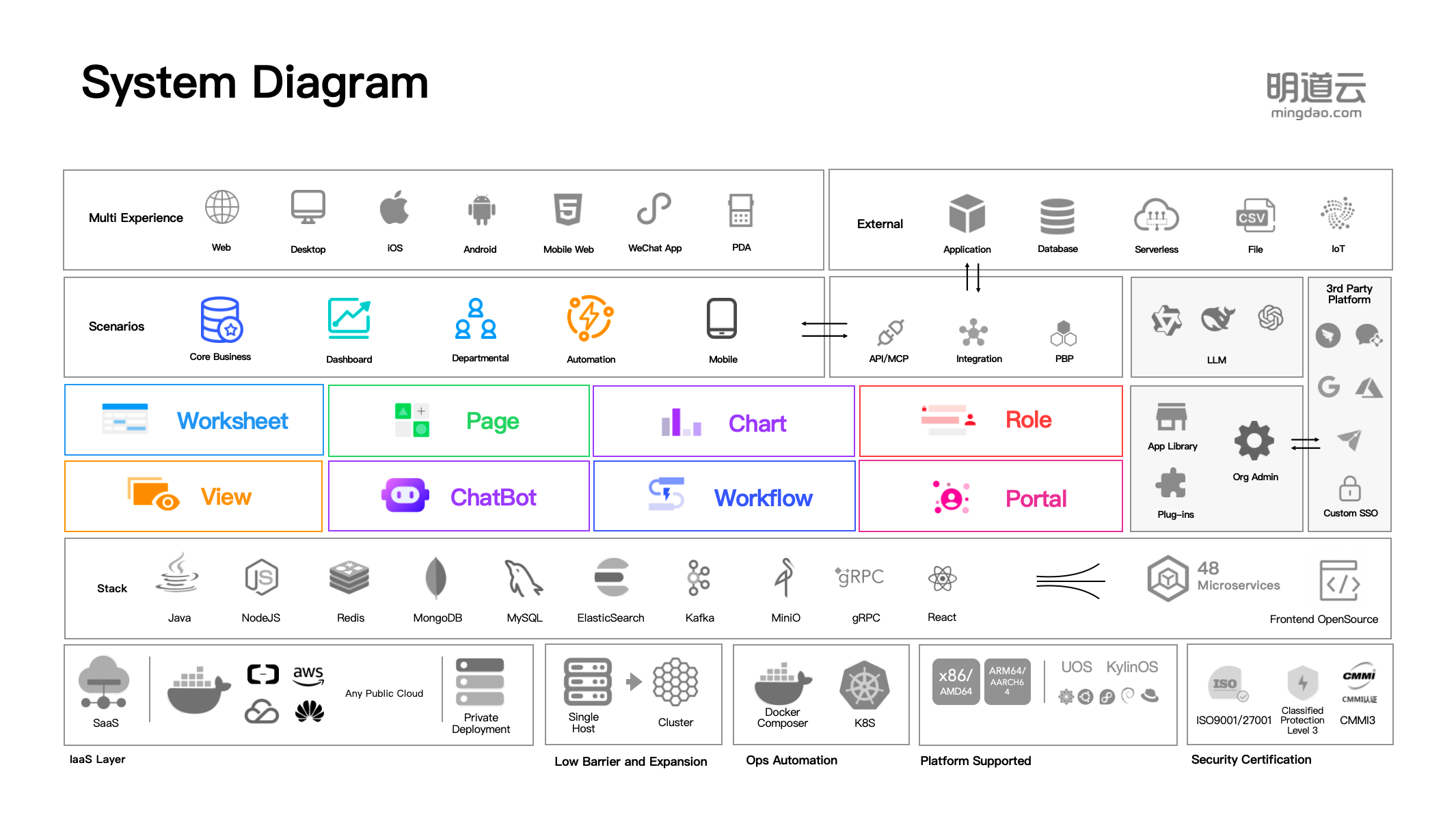 The HAP platform adopts a cloud-native microservices architecture. The frontend (Web/H5) is built with the React framework, while the backend leverages a mix of Java, C#, and Node.js.