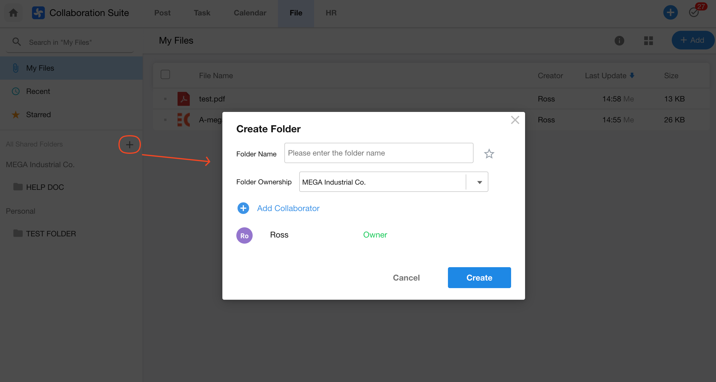 Click the “+” icon on the left sidebar to create a new shared folder.