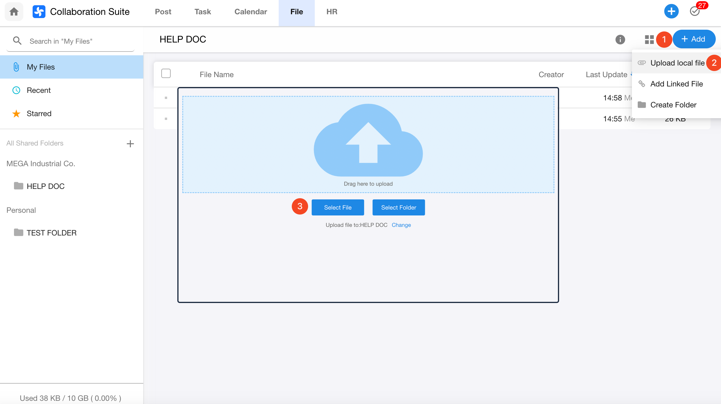Inside a folder, you can upload individual files or bulk upload an entire folder.