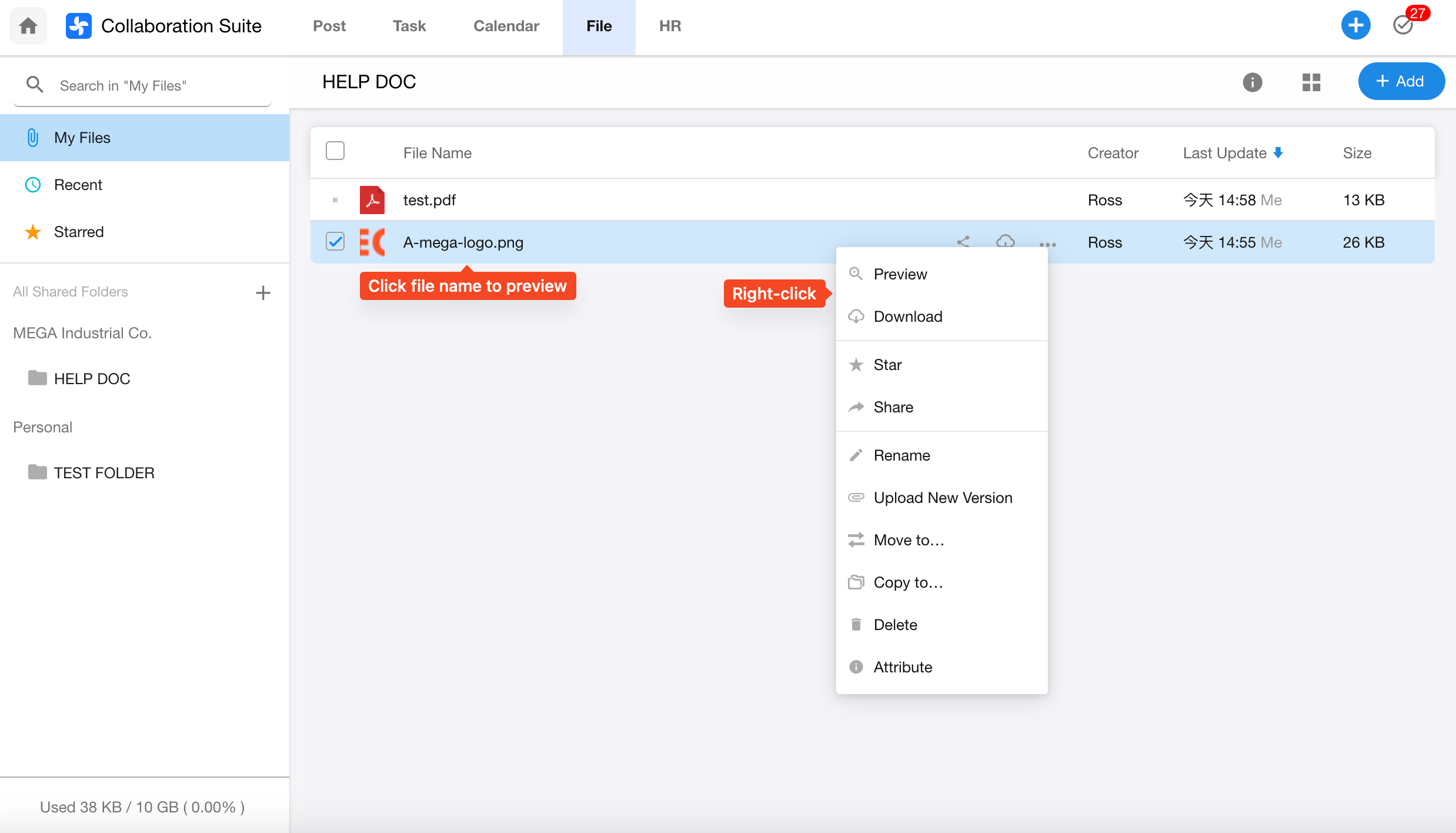 - File Properties: View file details, and manage download/edit permissions and visibility scope.