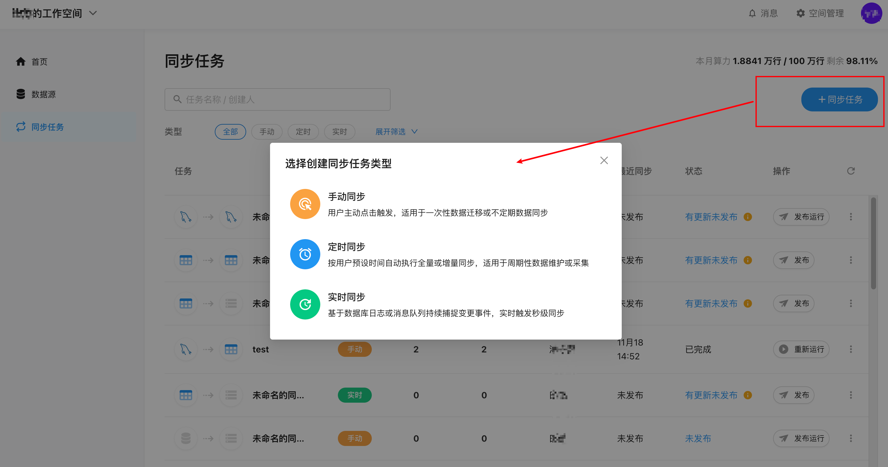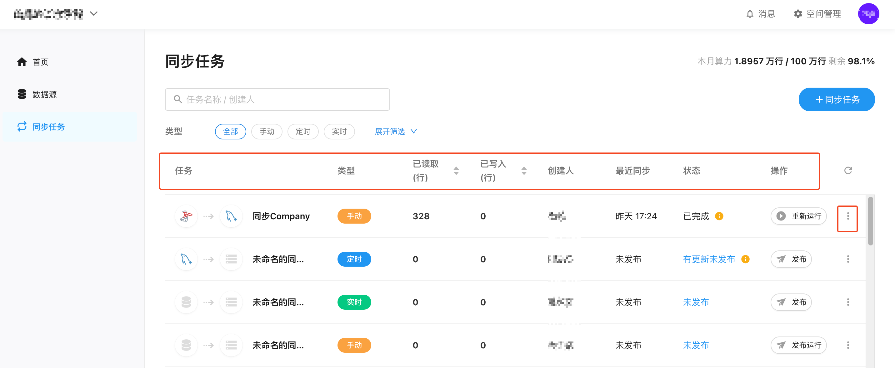在平台首页依次点击左侧导航「同步任务」,进入同步任务列表页。该页面会显示所有已创建的同步任务,可一目了然地看到每个任务的来源和目的地类型。