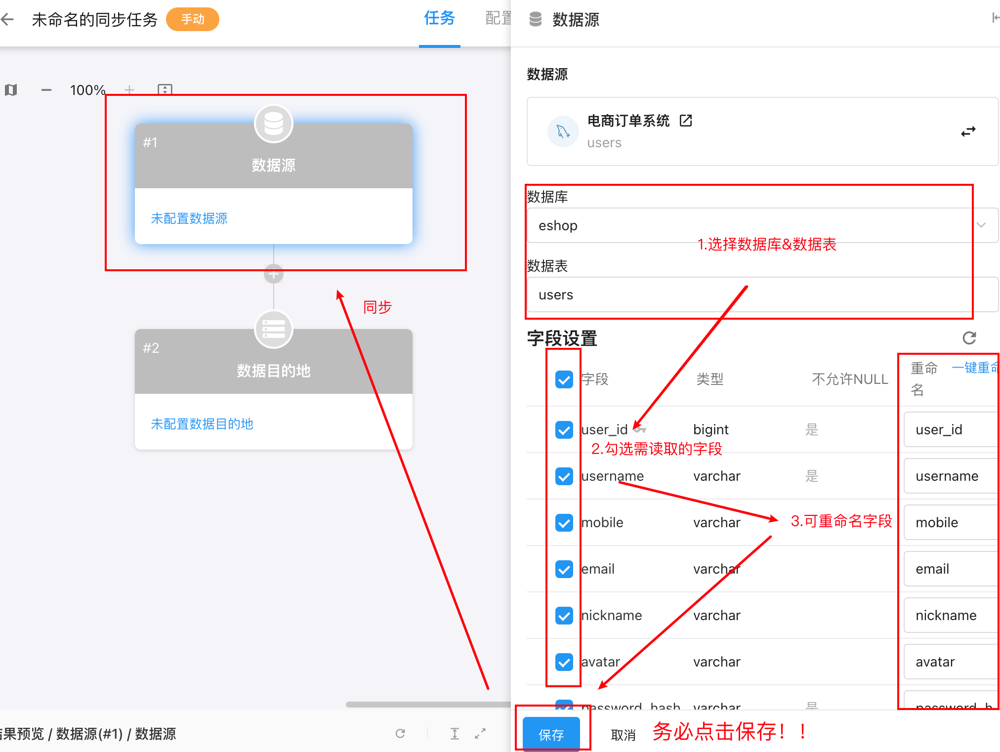 点击页面上的「+同步任务」按钮,弹出选择类型弹窗,选择一种任务类型,该任务的详细配置界面,也称为任务画布,以下为界面逐区说明: