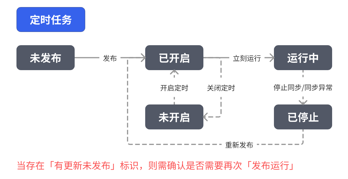 定时同步: 按照预先设定的时间计划自动运行的同步。用户可以在任务创建后点击“开启定时”按钮,根据提示设置同步频率(比如每小时执行一次,或每天固定时间执行)。设定好后,系统会在指定时间自动启动任务,无需人工干预。适用于需要周期性更新的数据场景,比如每天凌晨同步新订单数据或每小时同步销售数据等。