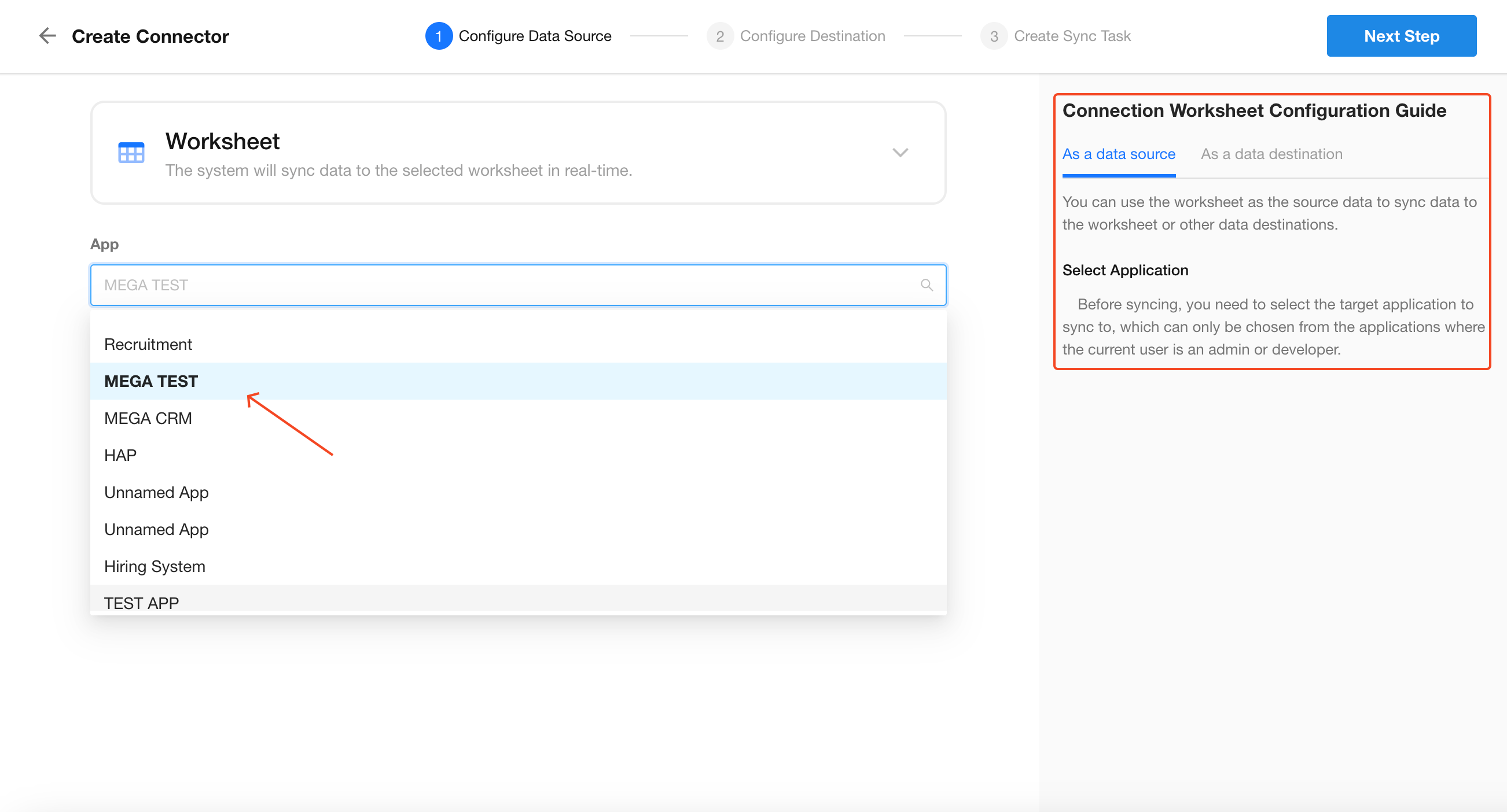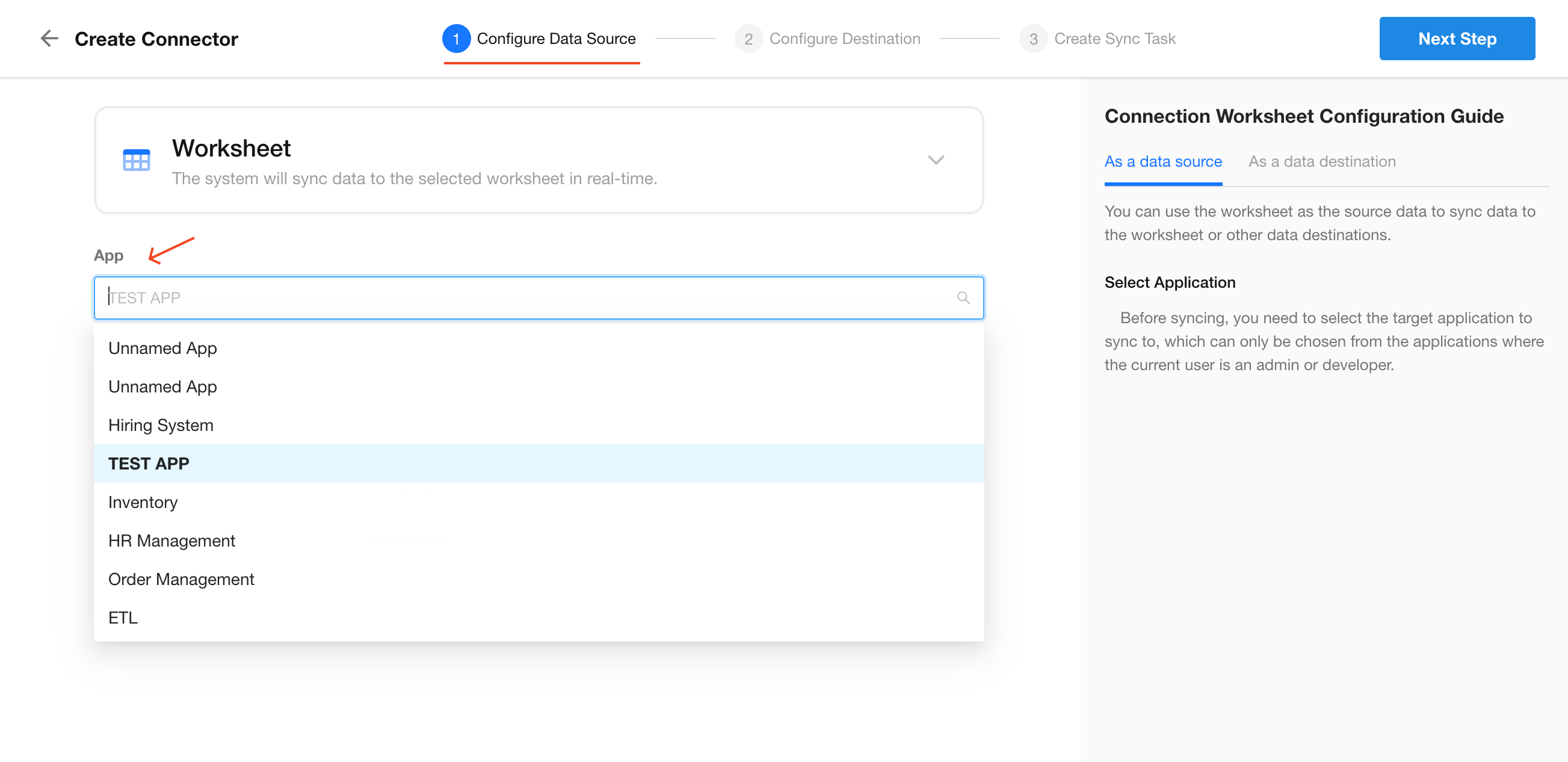 Choose the target app where the worksheet will be created or updated. Then, click Next.