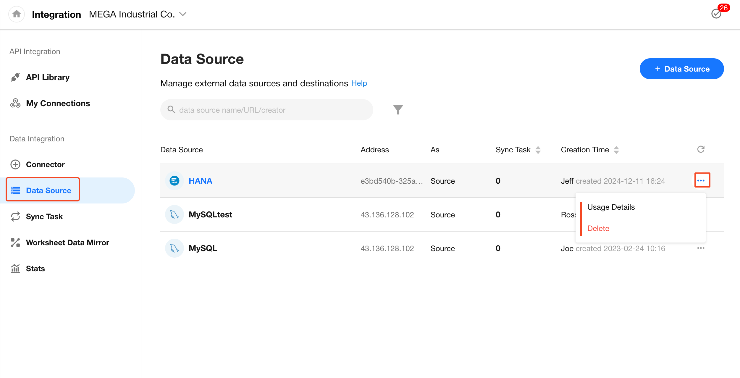 The Data Sources page stores all source and destination connection configurations created during connector setup. When creating a new sync task, you can reuse any previously configured data sources.