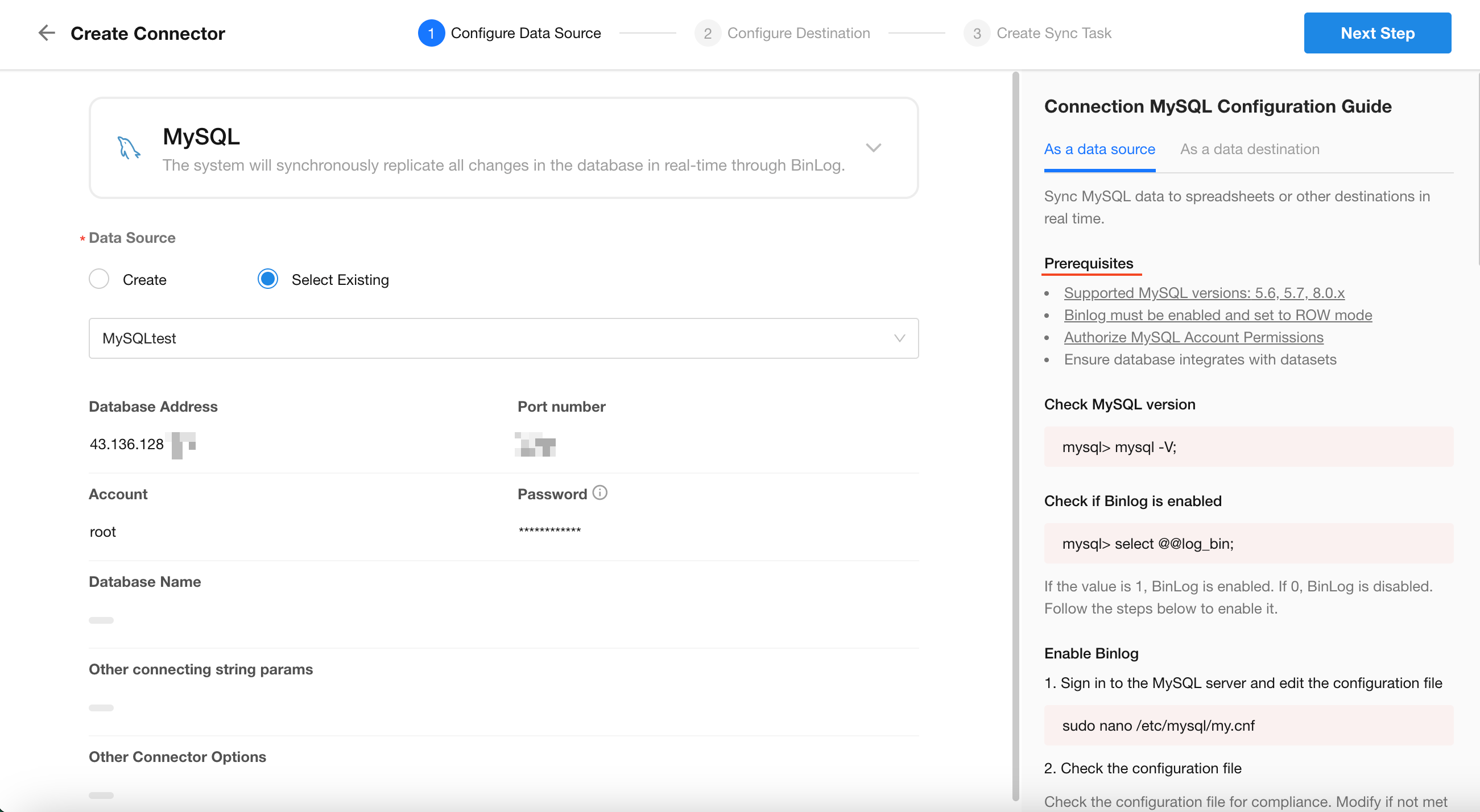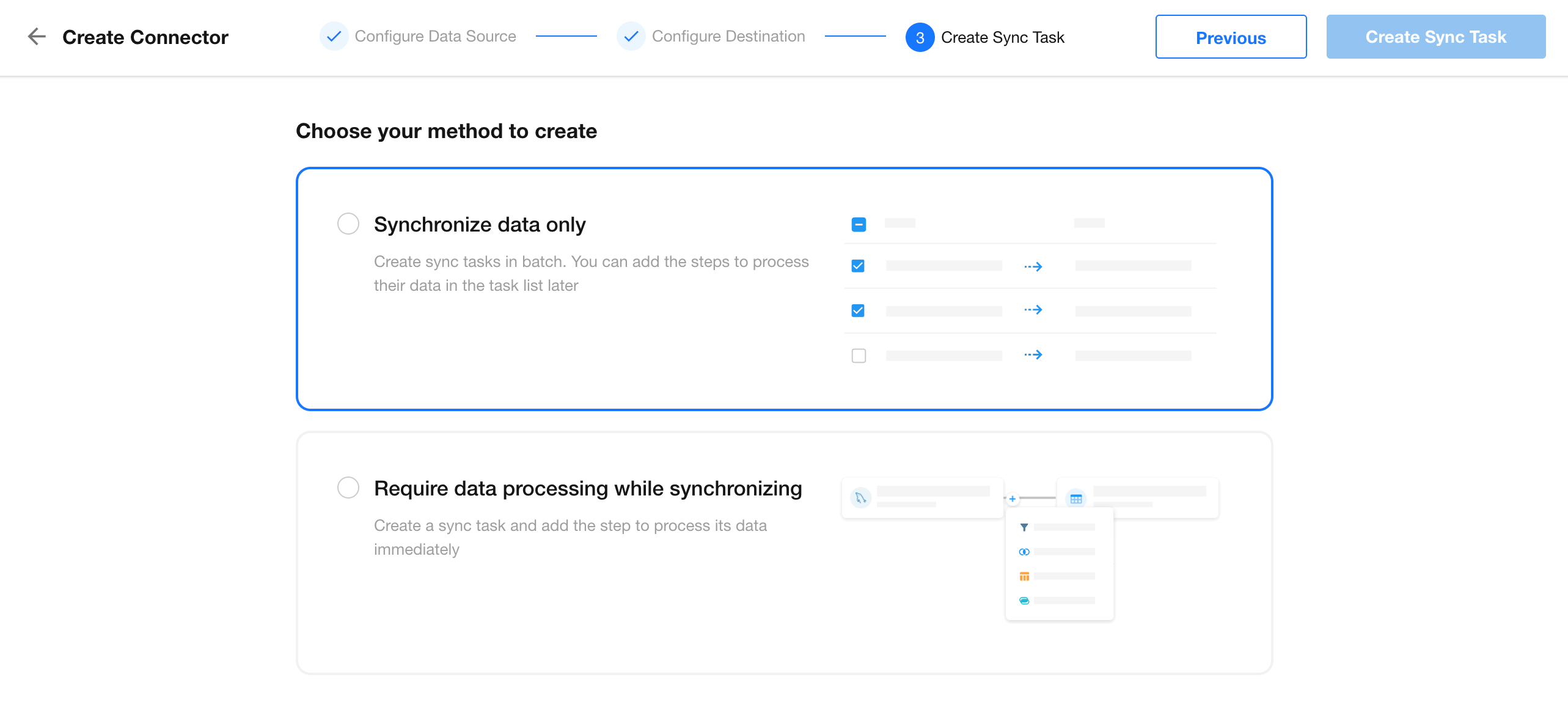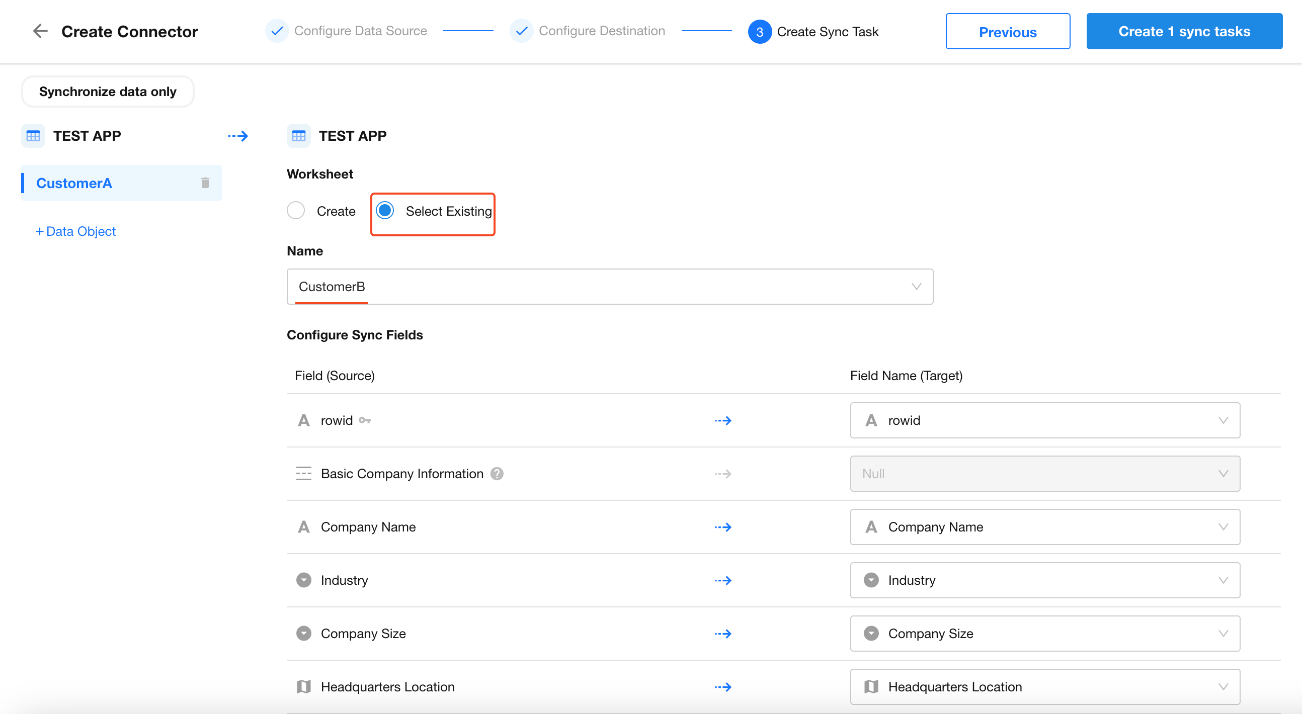 A connector establishes the connection between source and destination databases and defines the field mapping. During this step, you can create multiple sync tasks from multiple tables within the same data source.