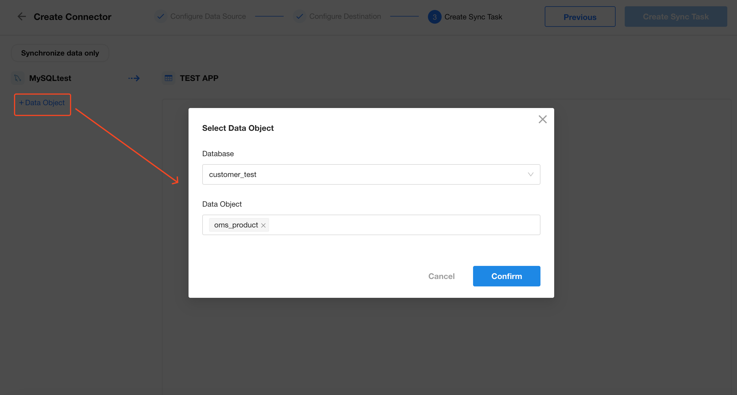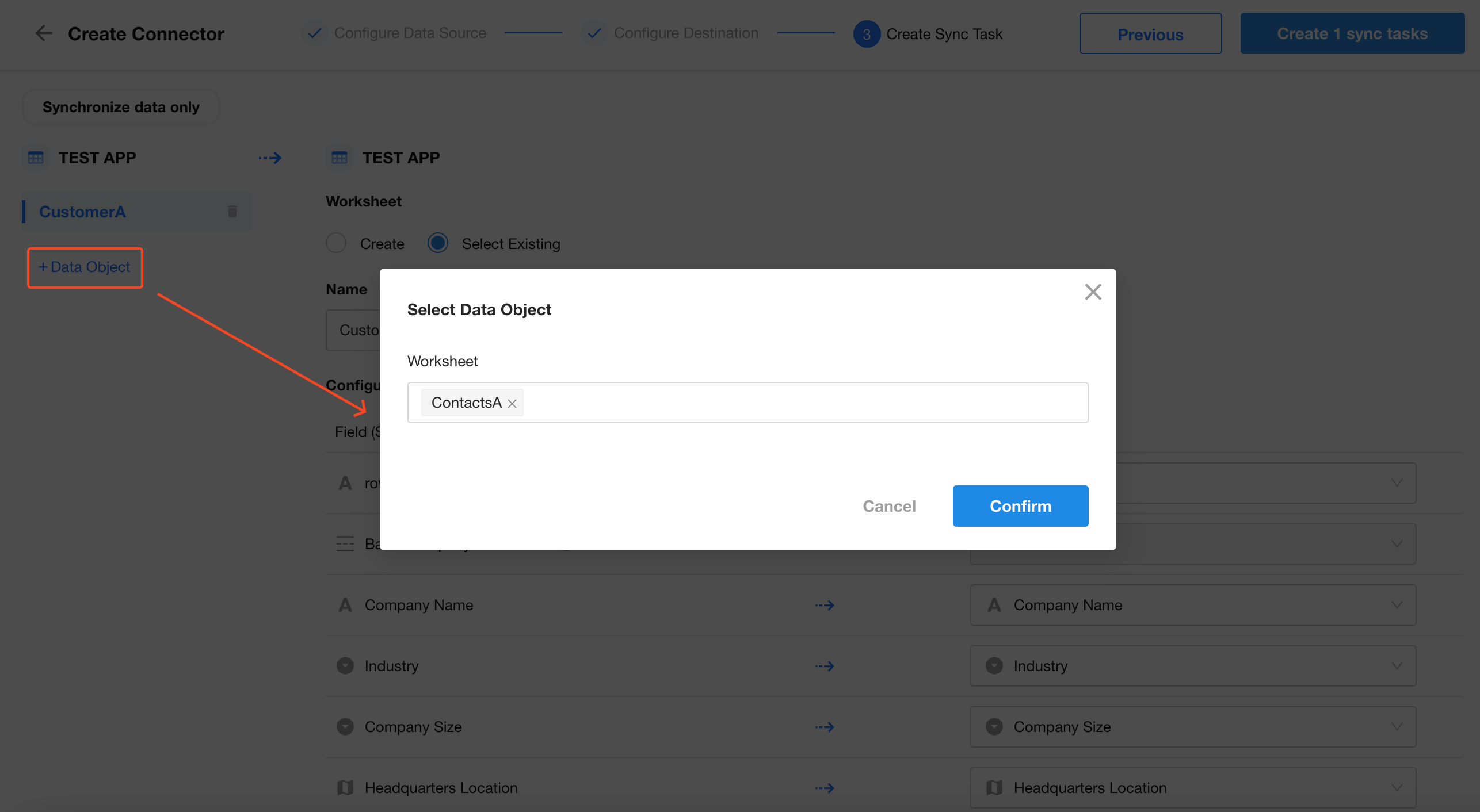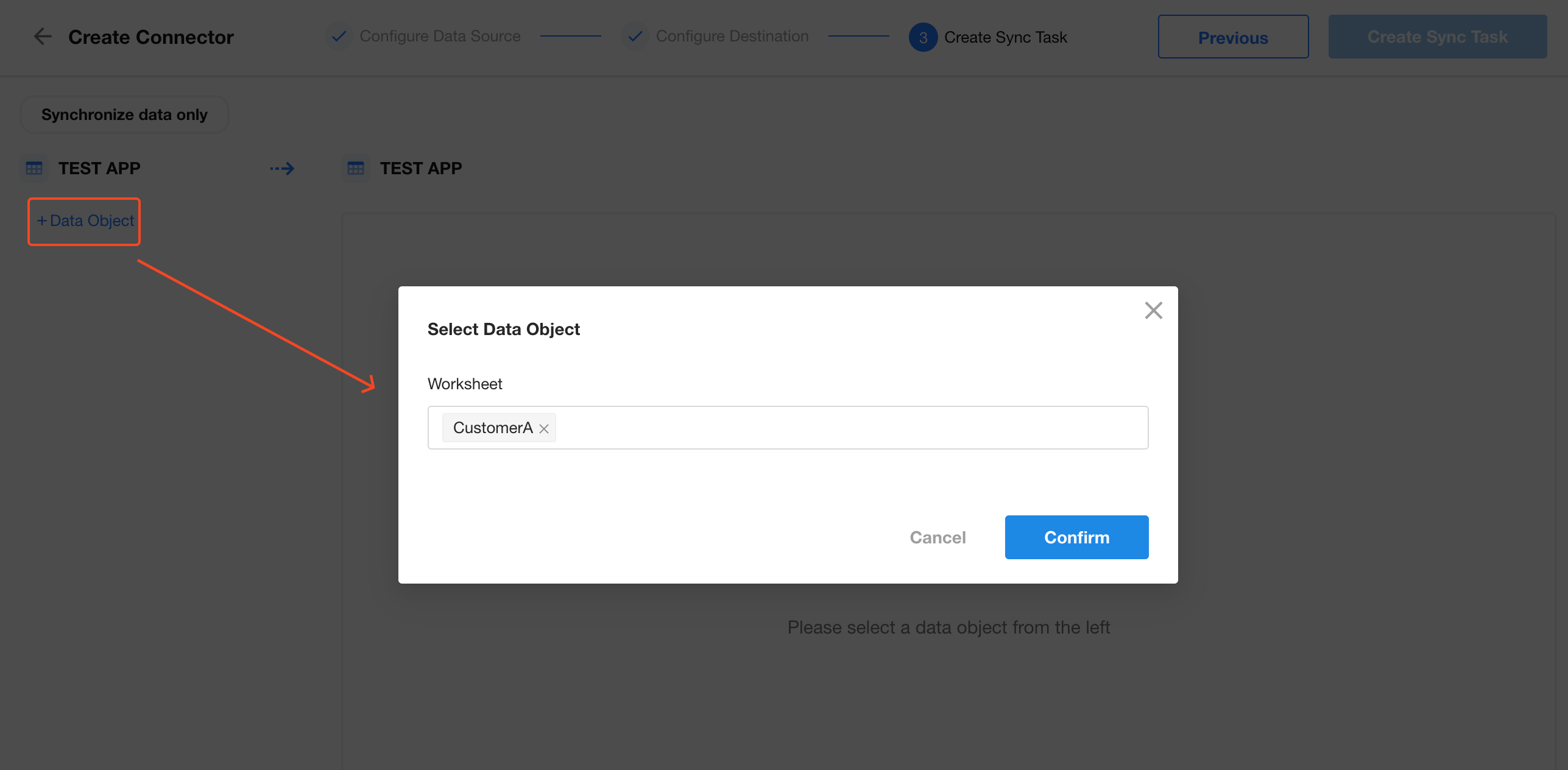 Click + Data Object to choose the worksheet to sync (Customer Worksheet A).