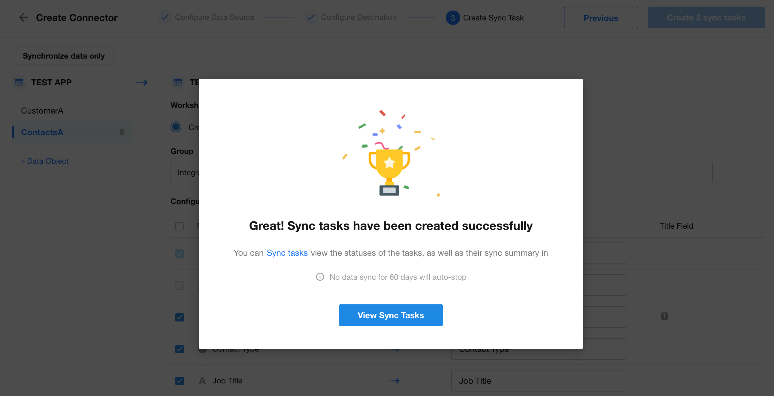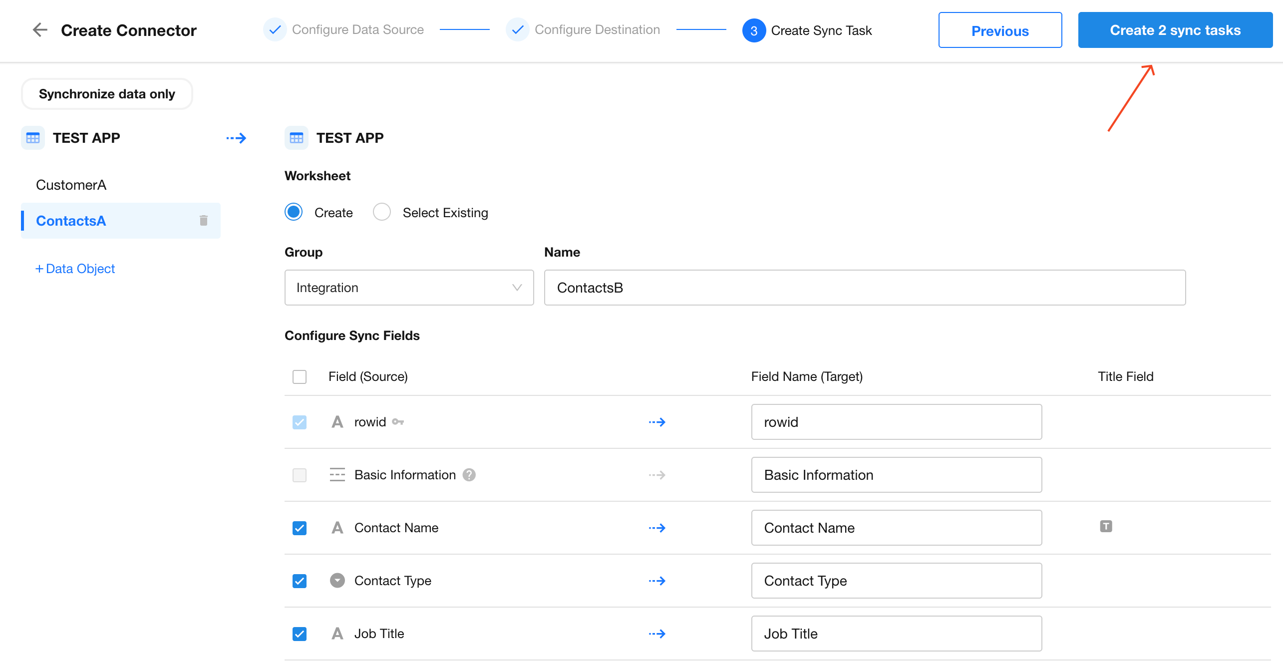 Next, define the field mapping between source and destination, then click “Create X Sync Tasks.”