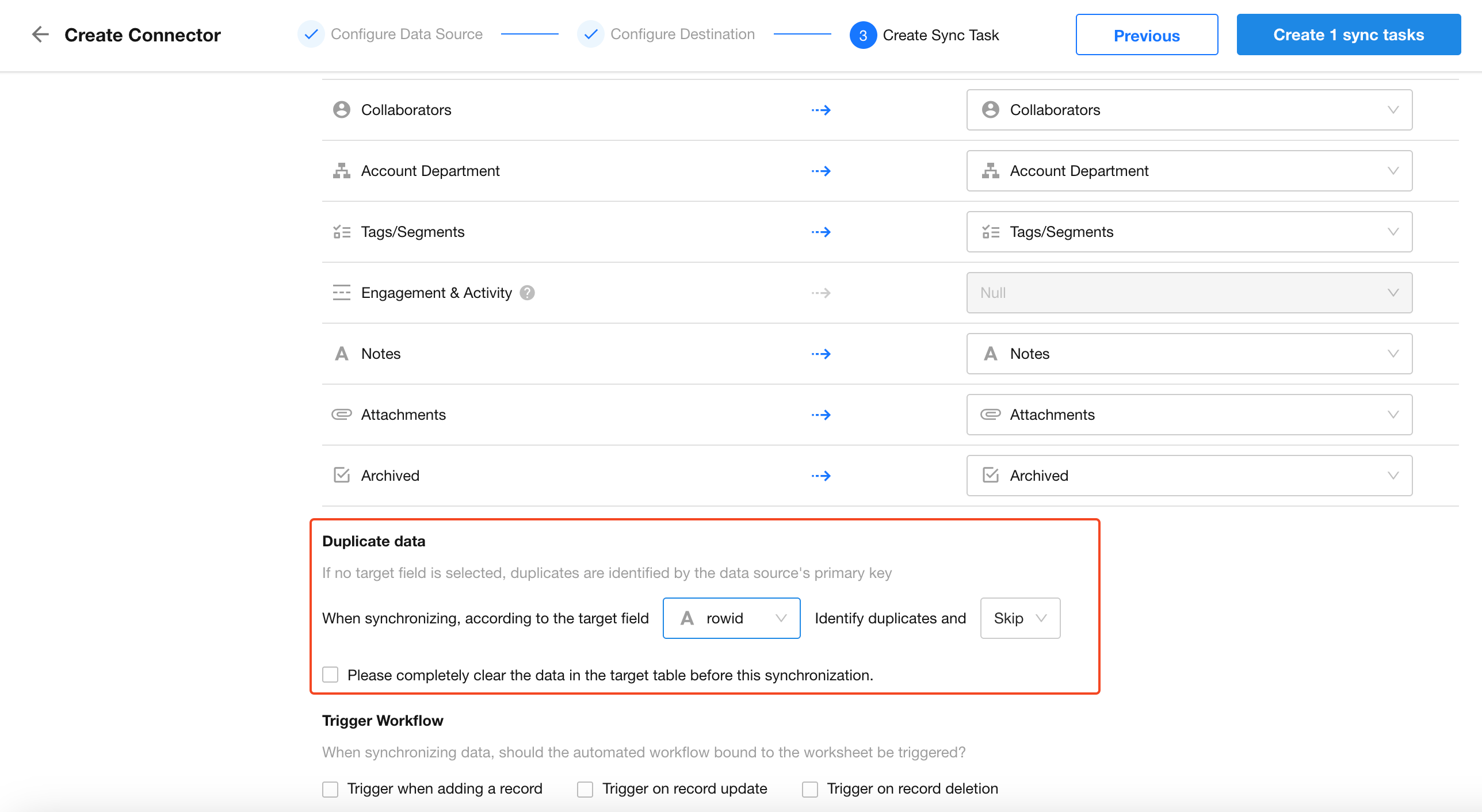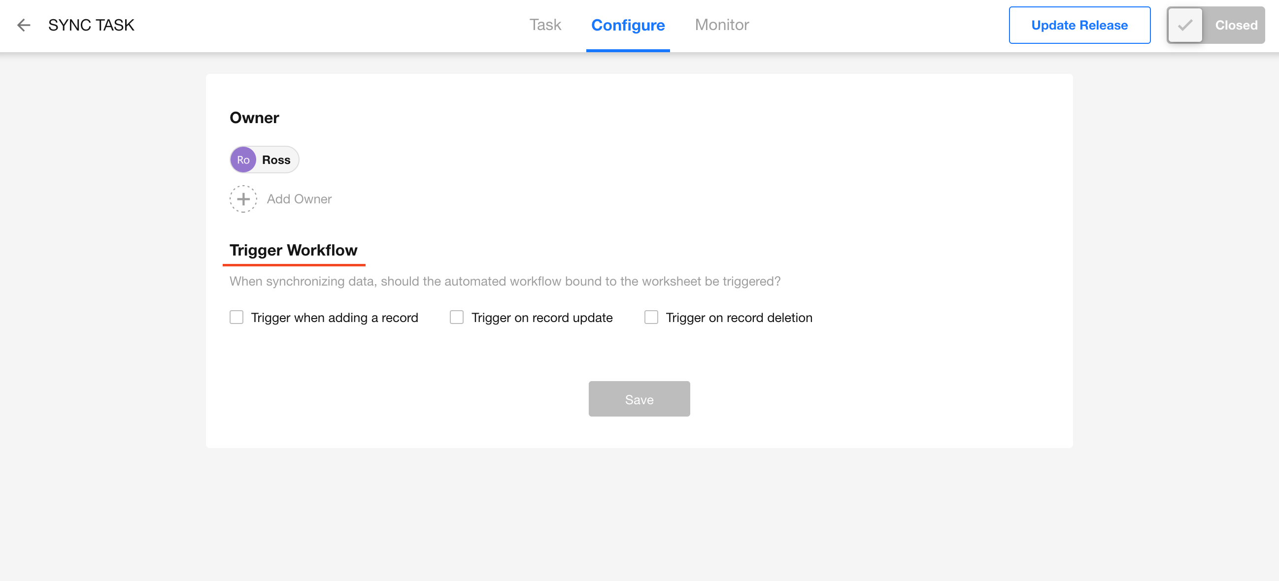 Click the task name to configure whether the synchronized data should trigger associated workflows.