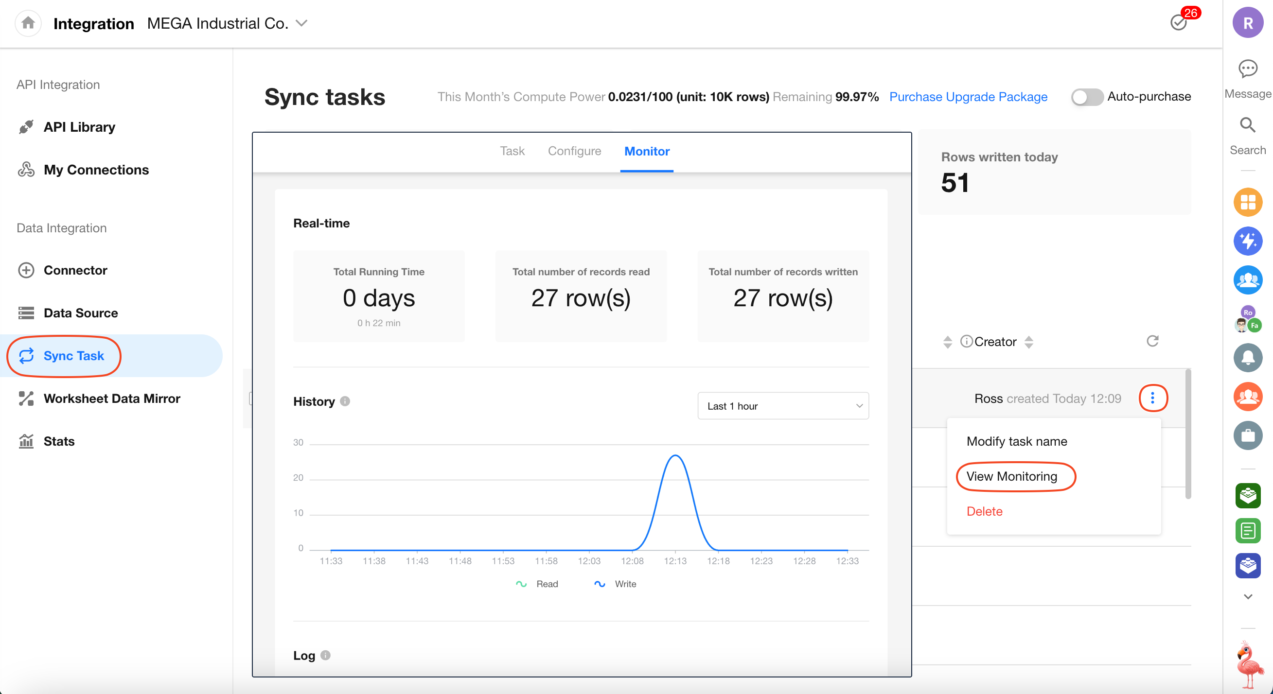 Once a sync task is created, you can modify its settings, monitor its status, and track the volume of synchronized data. The monitoring dashboard provides insights such as cumulative run time, total records read and written, and recent data activity through trend charts.