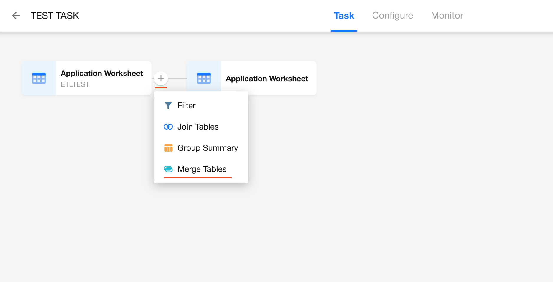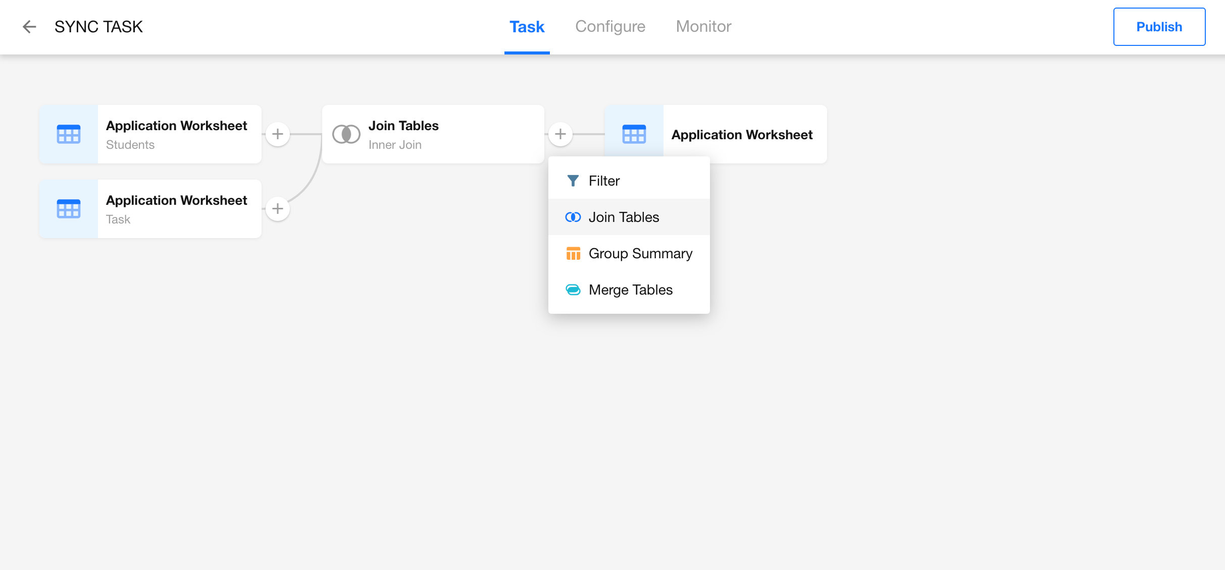 In any data sync task, hover between two nodes and click “+” to add a Merge Tables node.