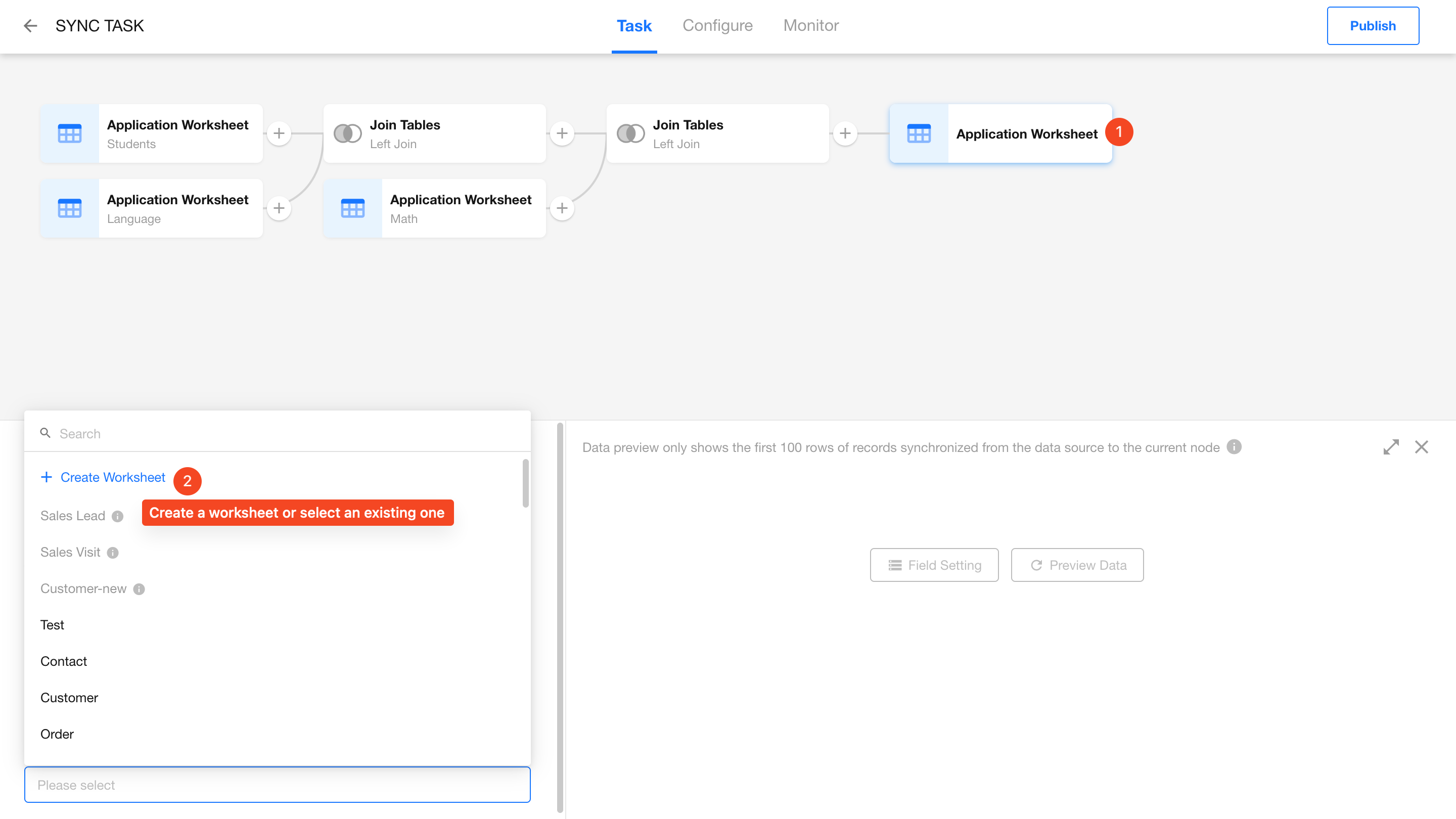- Read Data Source: Select the data source you want to join — this can be a worksheet or an external database table.