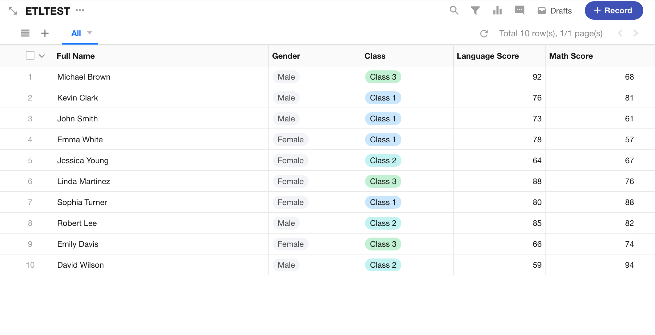 Assume you have three worksheets: Students, Math Scores, and Language Scores. If you want to display the scores for each subject in a single table for every student, you can use the Join Tables node to merge the data from all three worksheets into one.