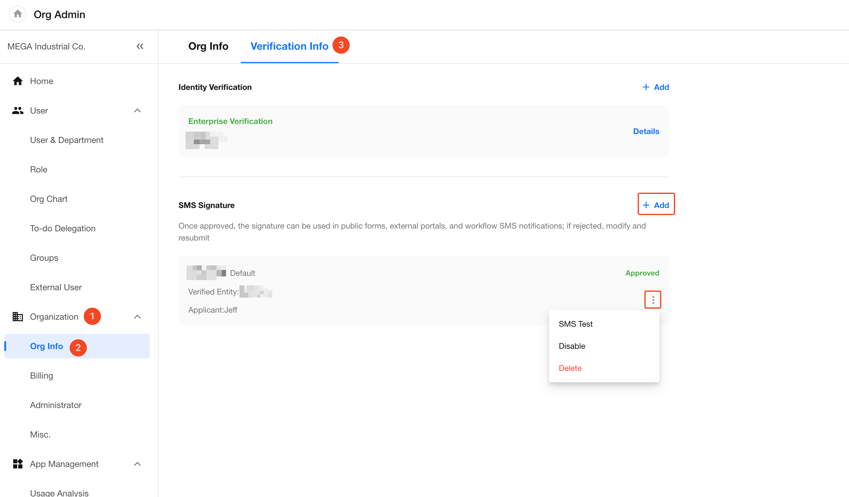 Organization admins can create and manage SMS signatures by navigating to [Org Admin] > [Organization] > [Org Info] > [Verification Info] via the profile avatar menu.