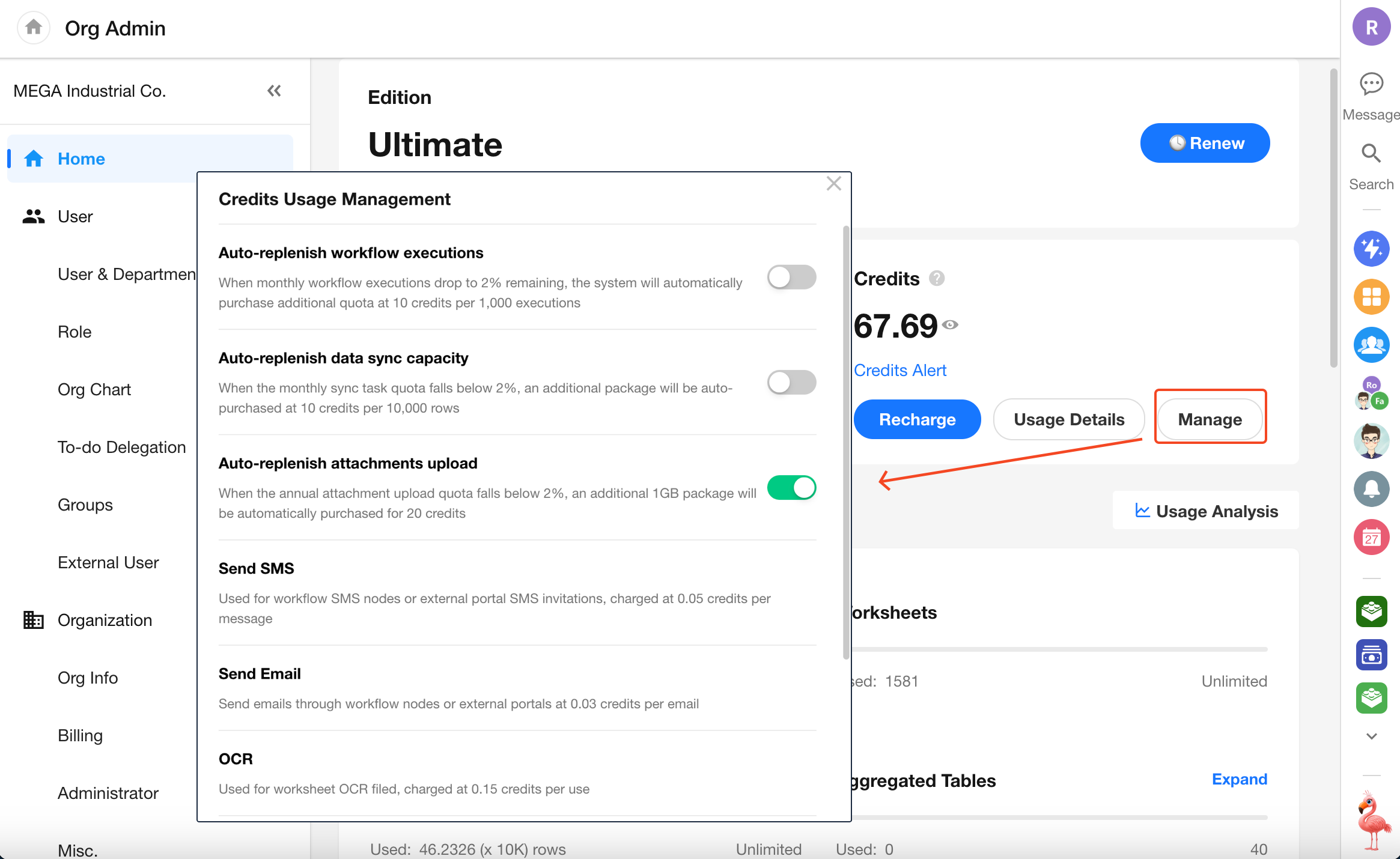 In the Credits Management section, all usage-based billing items are listed.