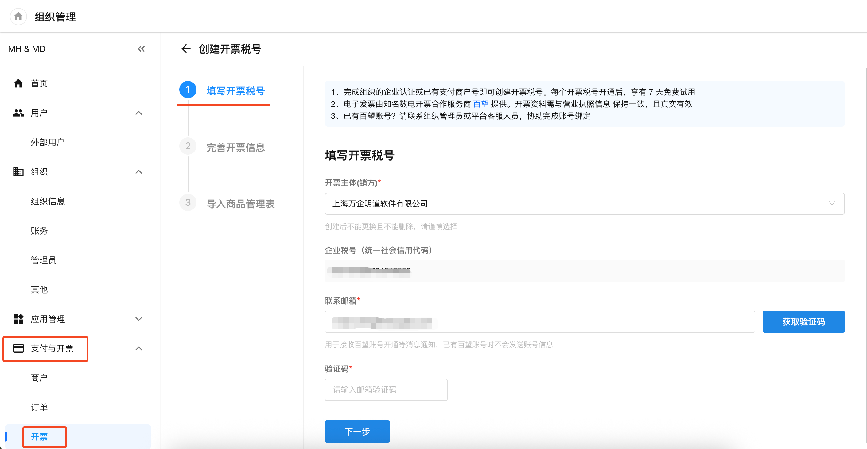组织管理员点击系统头像,依次点选 "组织管理" > "支付与开票" > "开票",在开票税号管理页面点击“立即申请”或“创建开票税号”开通电子开票服务。 电子开票服务由百望云提供,需提交资料到百望云开通税号,支持 7 天免费试用。