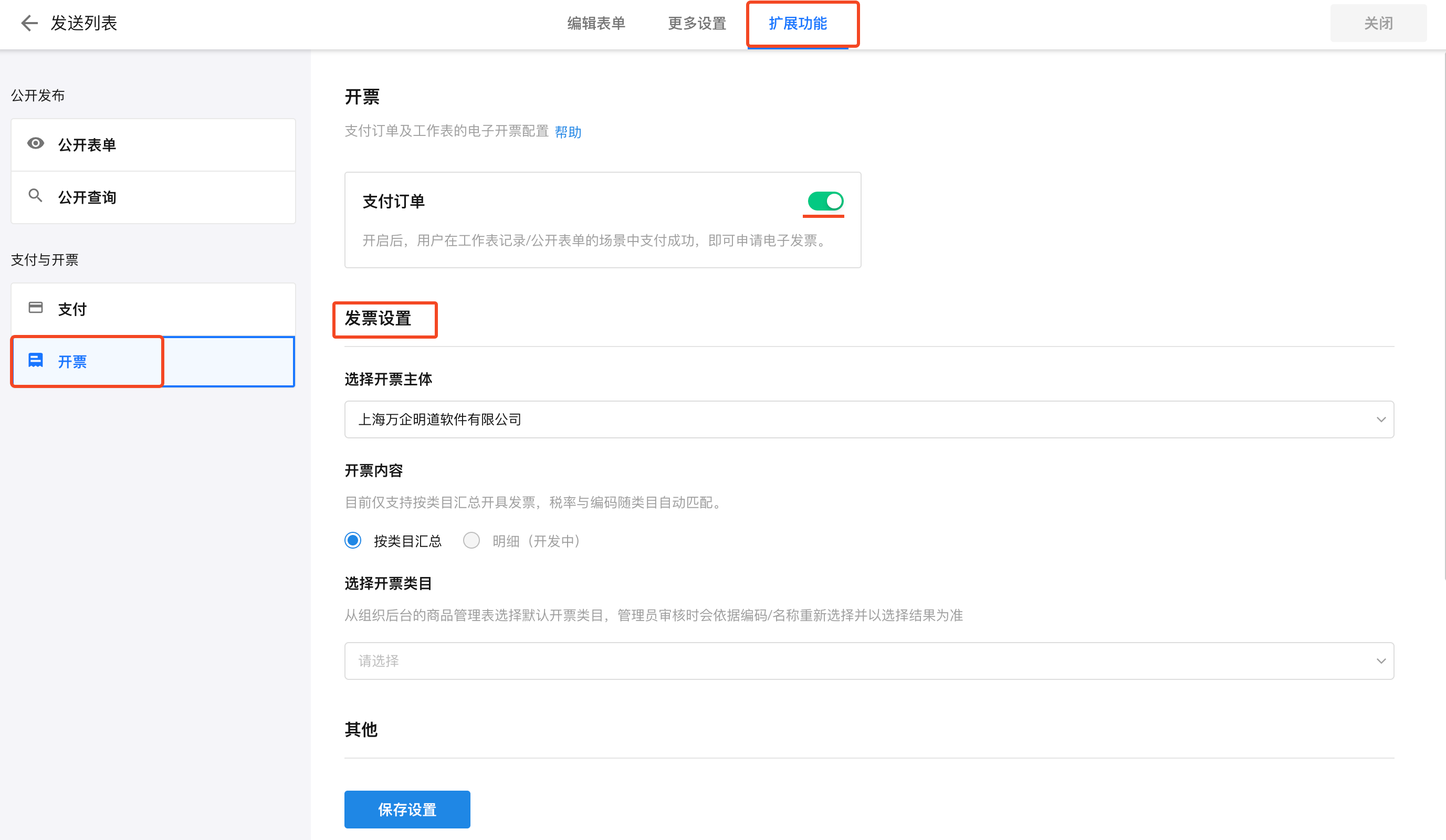进入工作表的表单编辑页面,依次点选 “扩展功能” - “开票” ,开启"订单支付"后,配置发票设置。