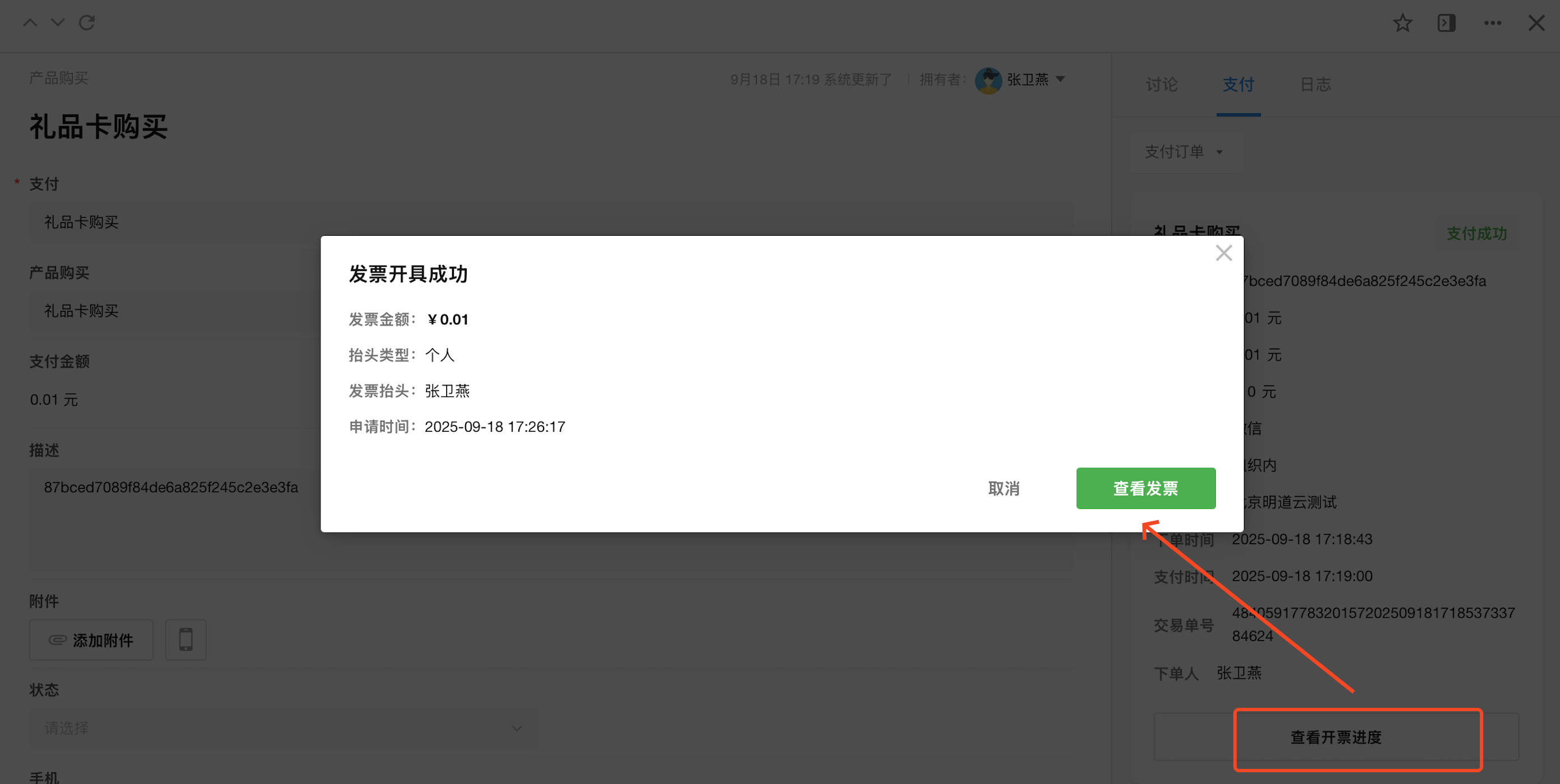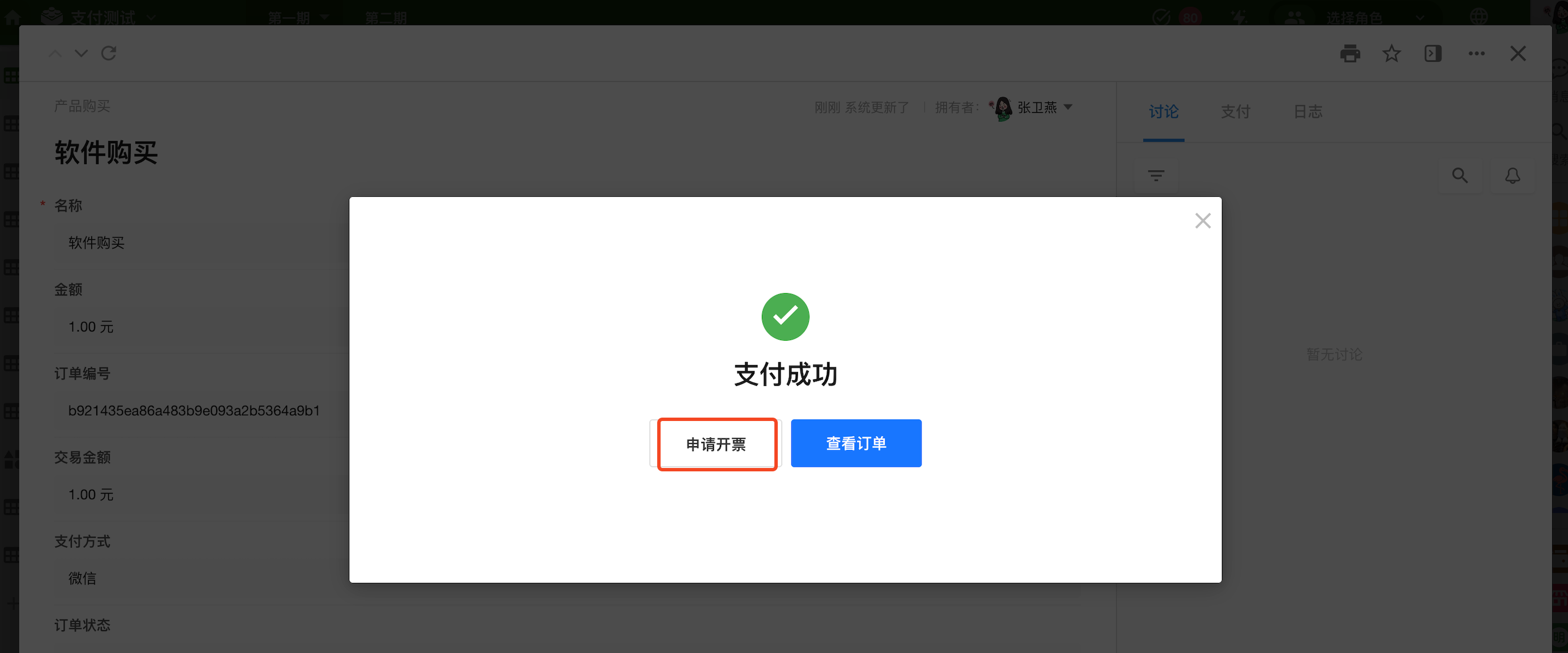 • 工作表记录付款成功后,可在记录详情右侧支付卡片点击立即申请开票