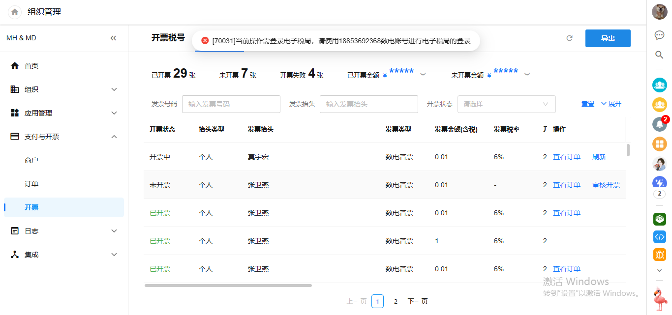 在“组织管理”-“支付与开票”-“订单”-“开票记录”中是当前组织所有的开票记录,未开票的记录会有审核开票的按钮,点击即可开票。