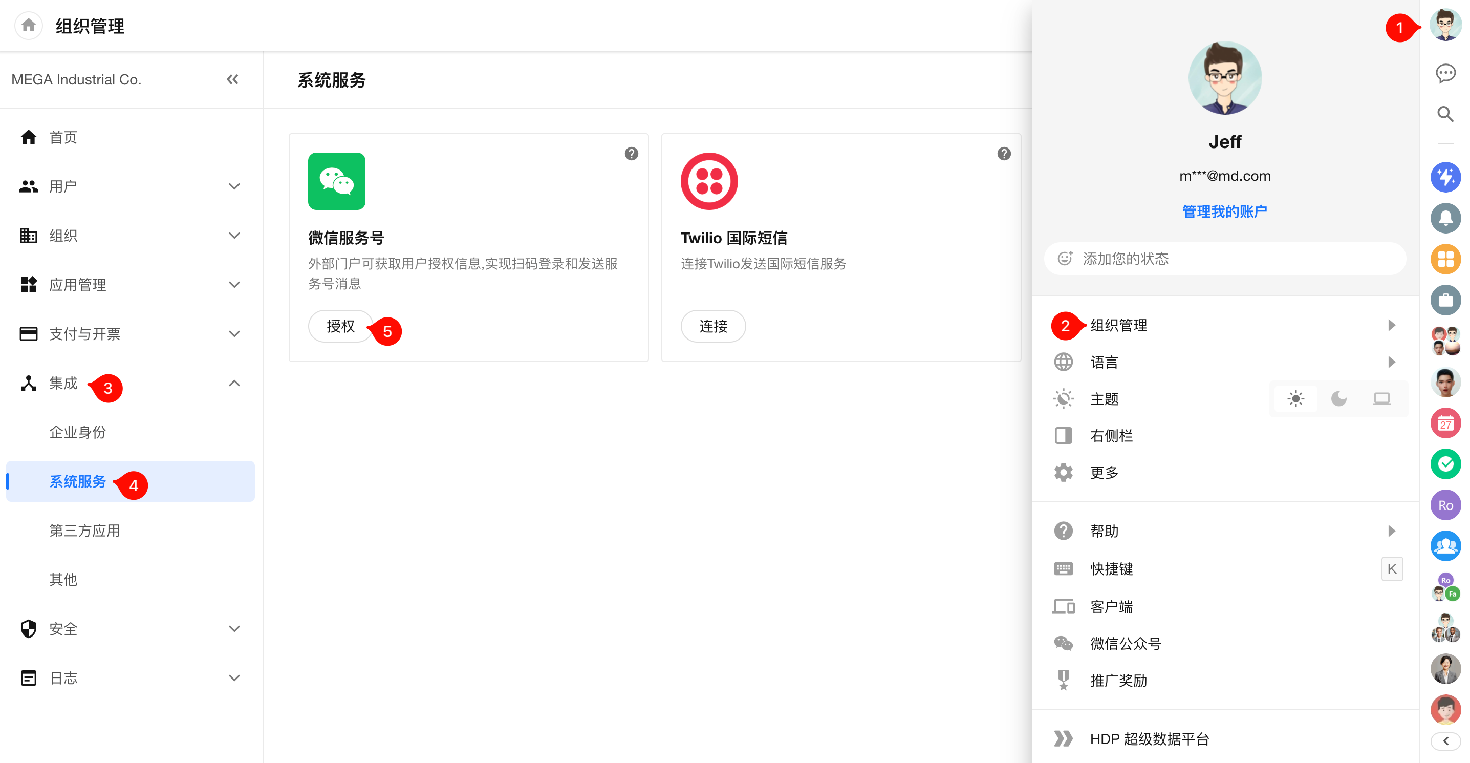 超级管理员点击 【头像】 > 【组织管理】 > 【集成】 > 【系统服务】。找到“微信服务号”卡片,点击【授权】。