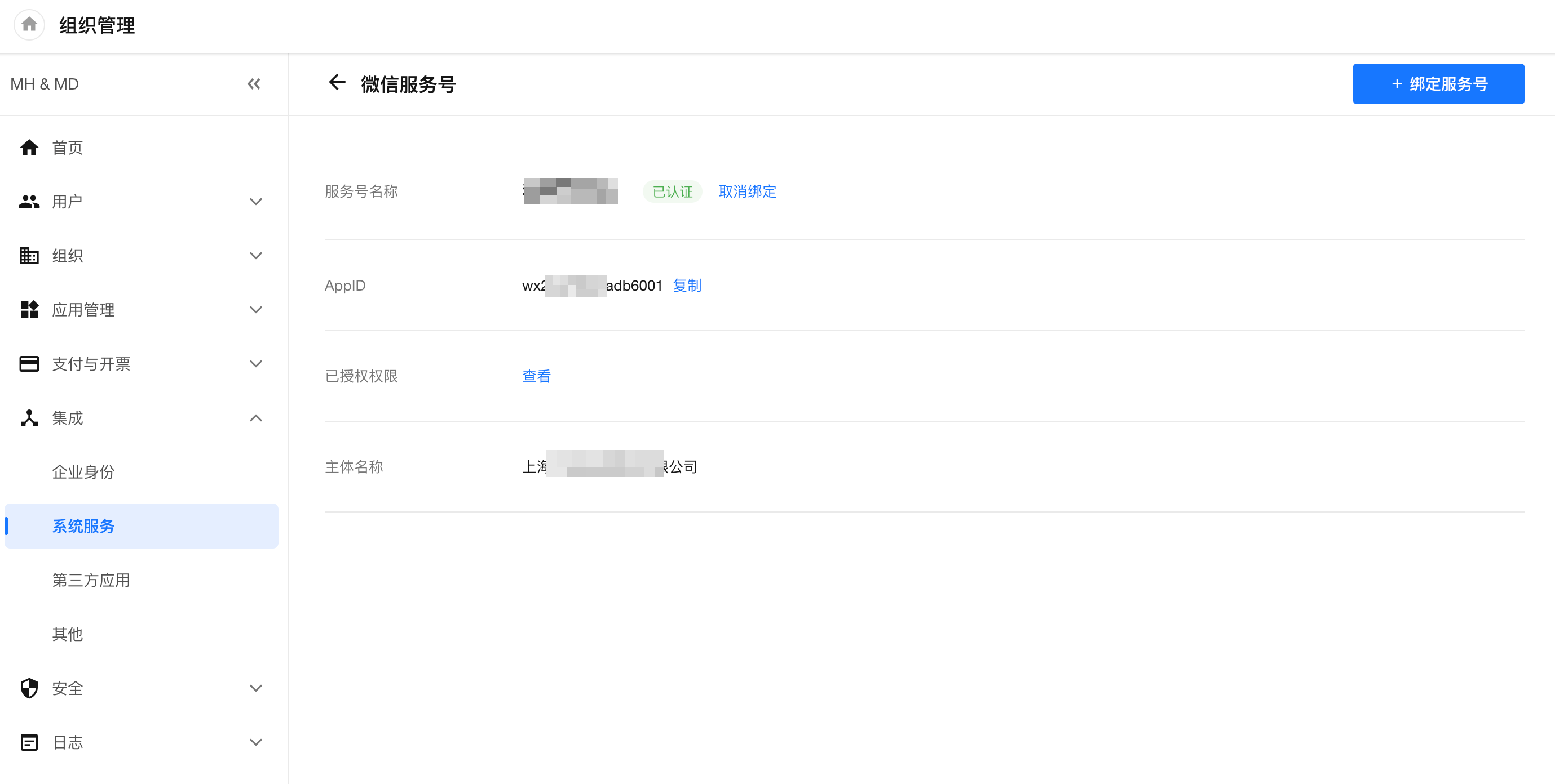 绑定多个: 组织支持关联 多个服务号。点击 【+ 绑定服务号】 即可增加。