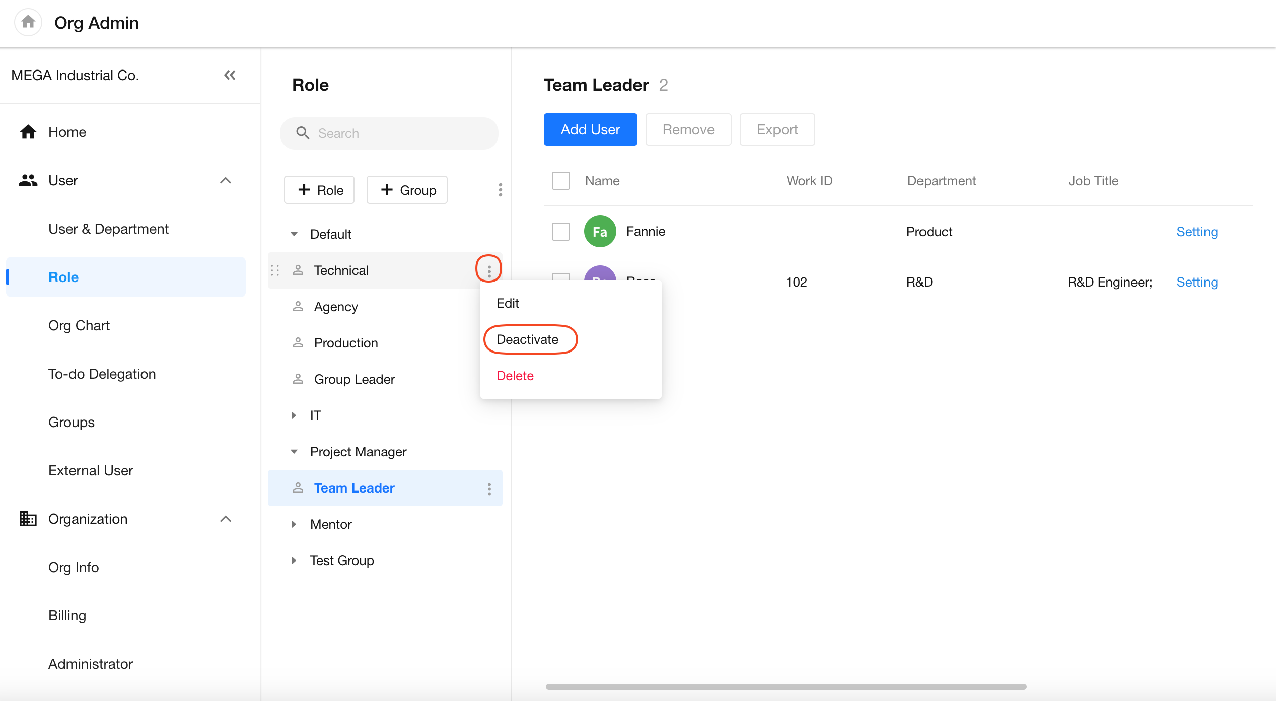 Both organization roles and role groups can be deactivated. In the organization role list, click the action menu next to the role name and select Deactivate.