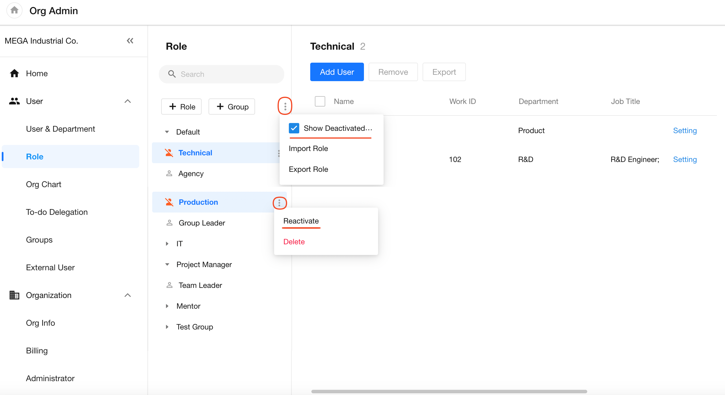 Administrators can view and manage deactivated roles and their members from the organization role list.