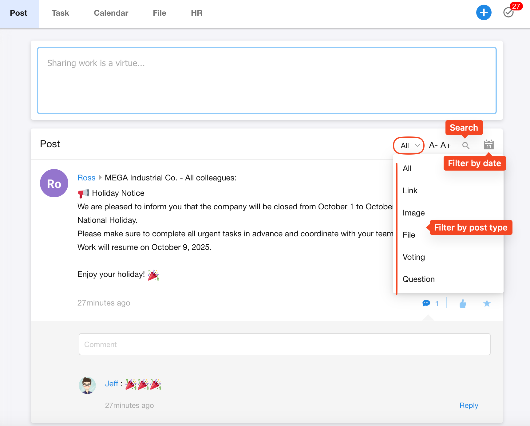 Displays all posts you’ve bookmarked. You can unstar a post by clicking the star icon at the bottom-right corner of the post. -