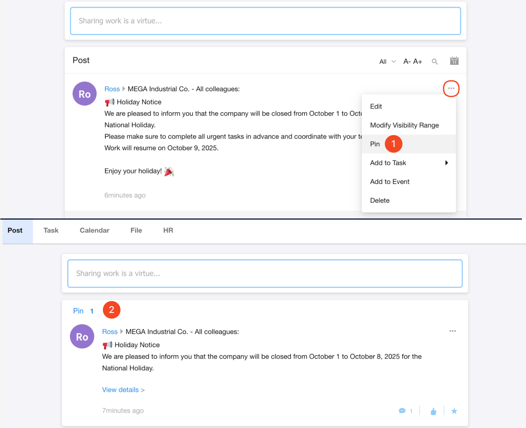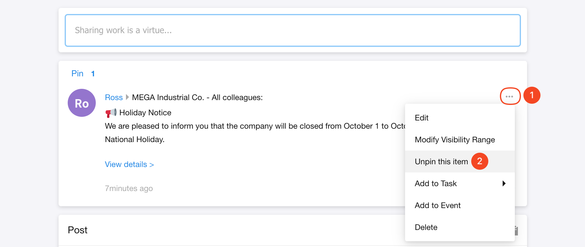 - After publishing, click the ... menu in the top-right corner of the post and select Pin.