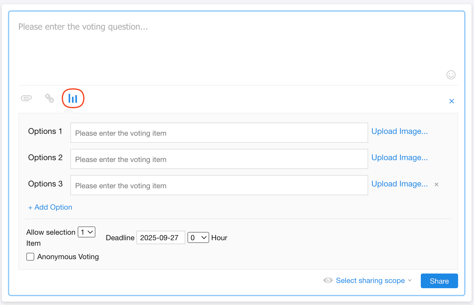 Click the Poll icon in the post composer, enter your options (up to 99), and optionally attach an image to each option.