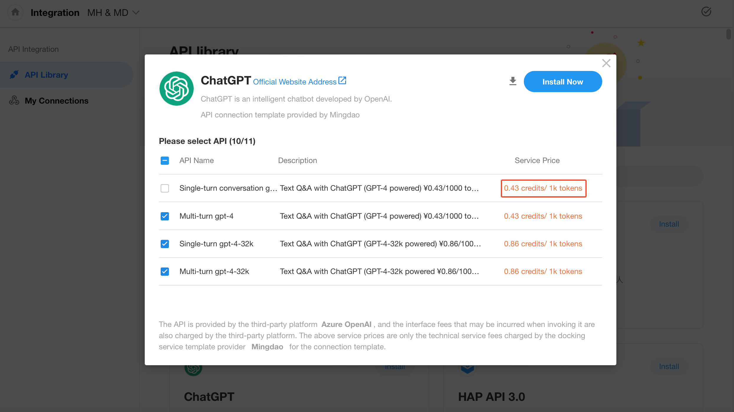 | Connector Template Service Fee in Integration Center | Charged per use | Each API has different pricing; billed based on published pricing. | |