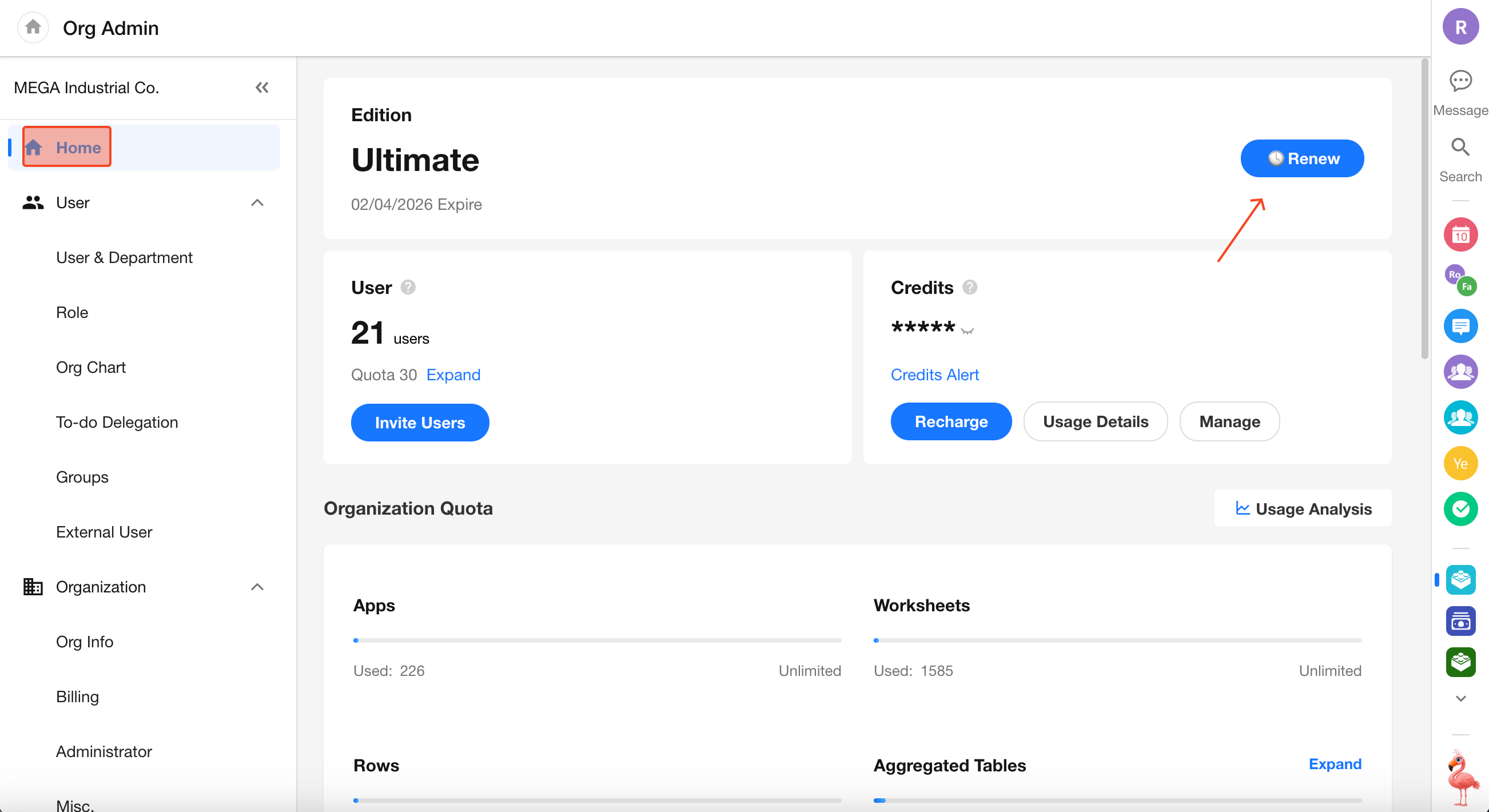 An Organization Administrator can log in to HAP from a desktop browser, click their profile avatar, then go to [Org Admin] > [Home] and click "Upgrade" or "Renew" to explore available features and pricing for HAP’s paid plans.