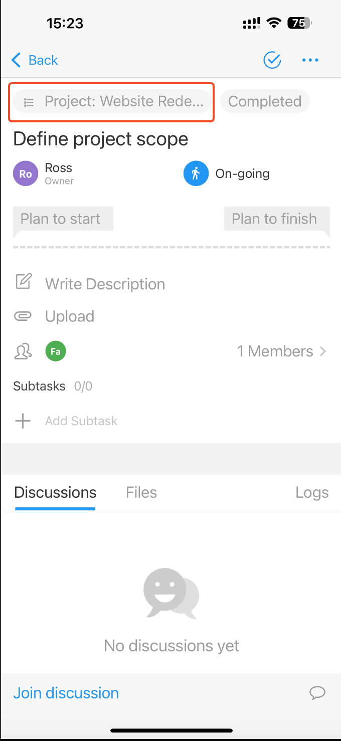 On mobile, tap the structure above the task name to make changes. You can associate the task with a project, change its board (stage), or link it to a parent task.