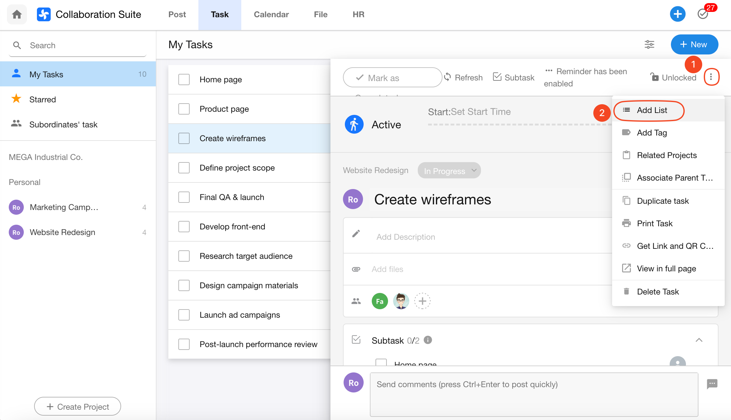 1. On the task detail page, click [More Actions] > [Add List] in the upper-right corner.