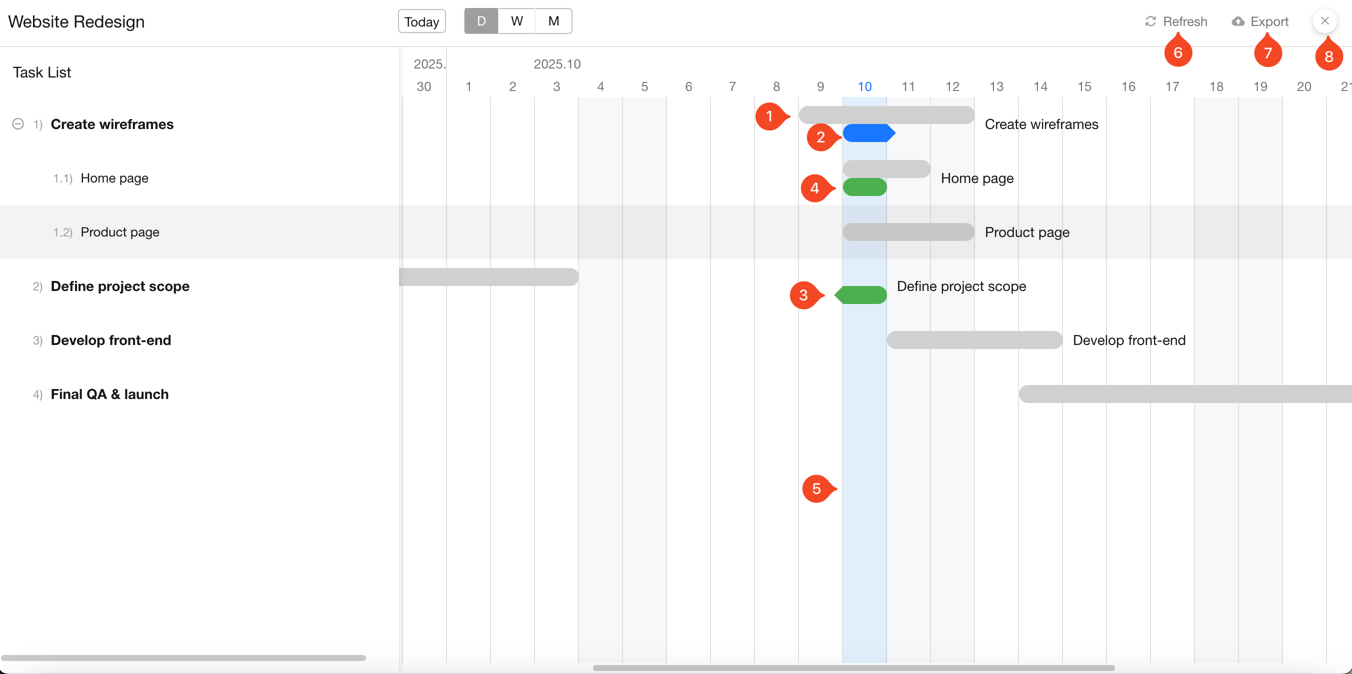 After editing tasks, click the Refresh button to update the Gantt chart.