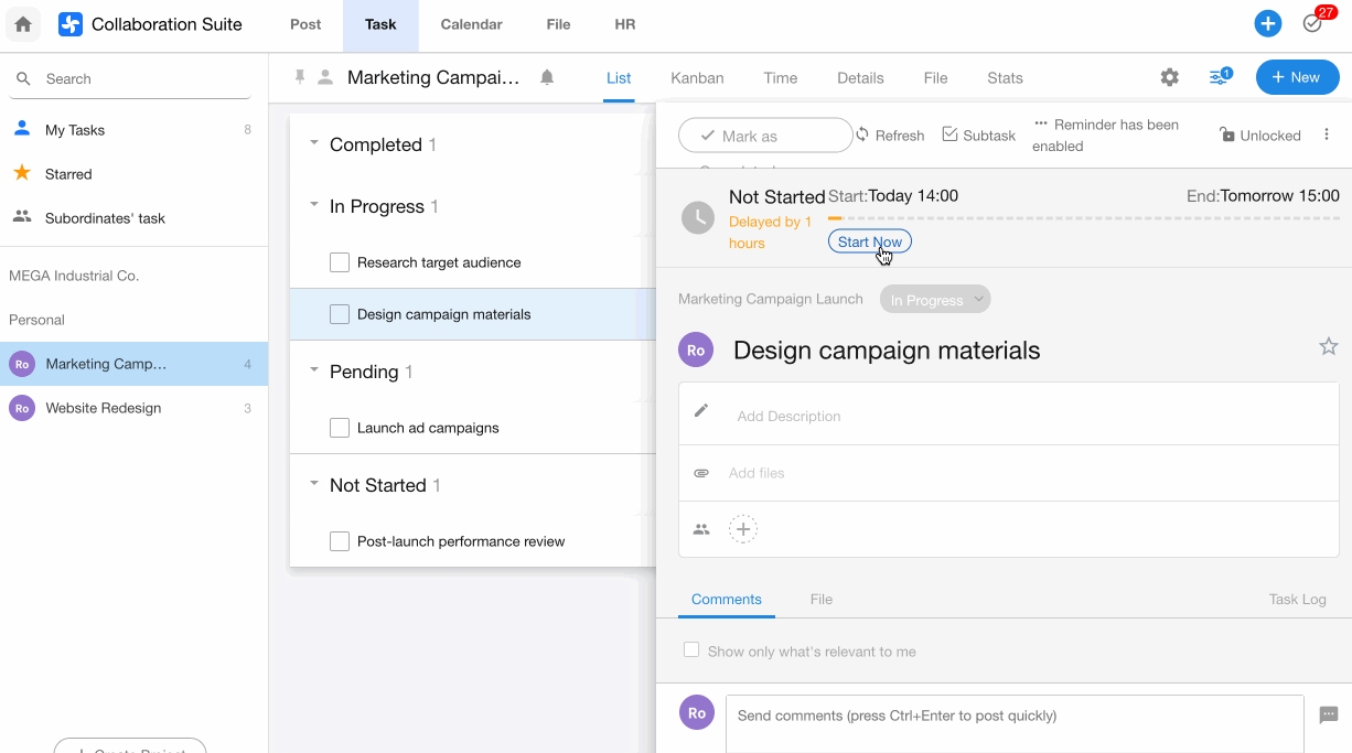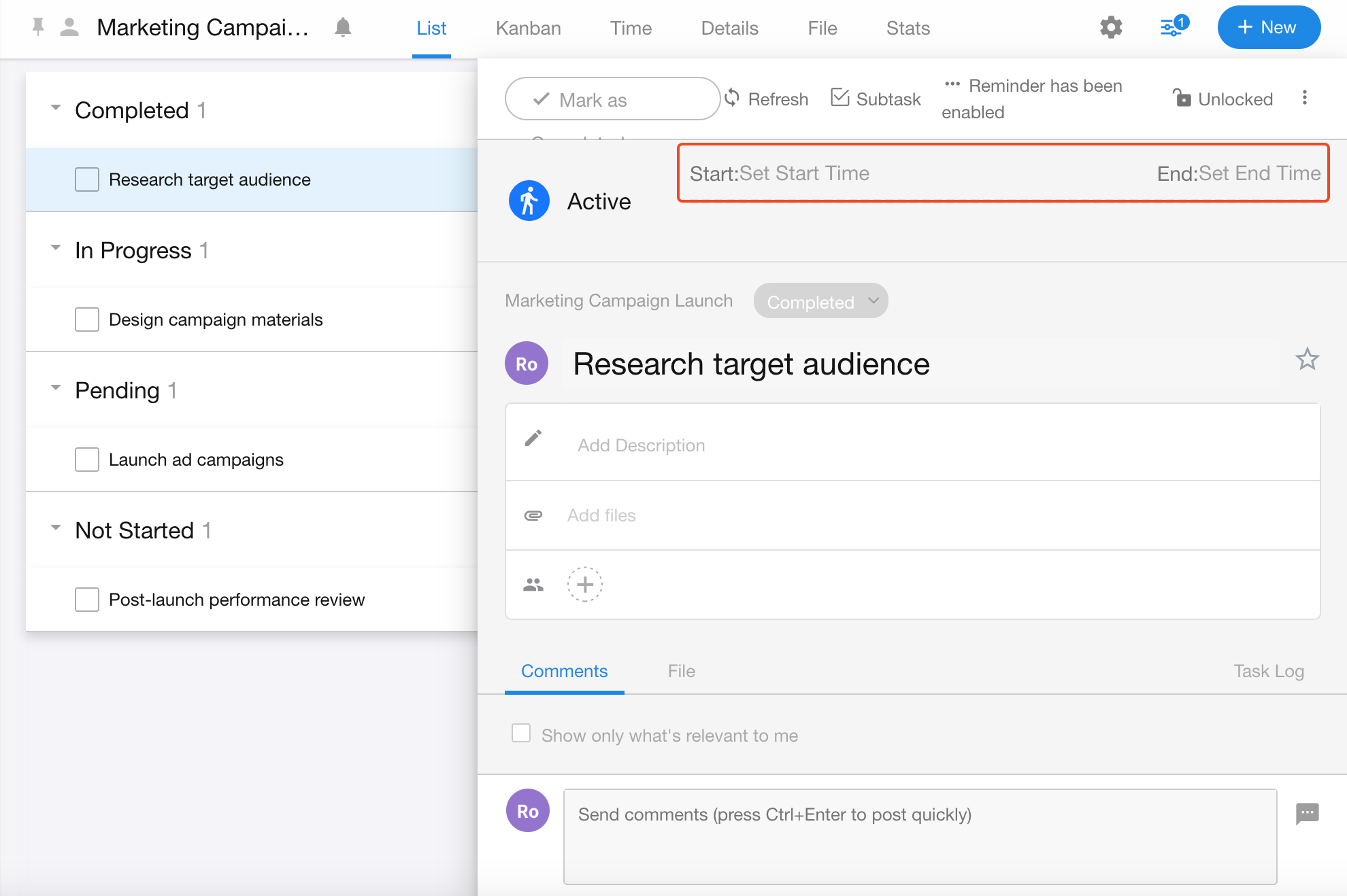 Users can set planned start/end times and actual start/end times for each task. These will be displayed in the task details page.