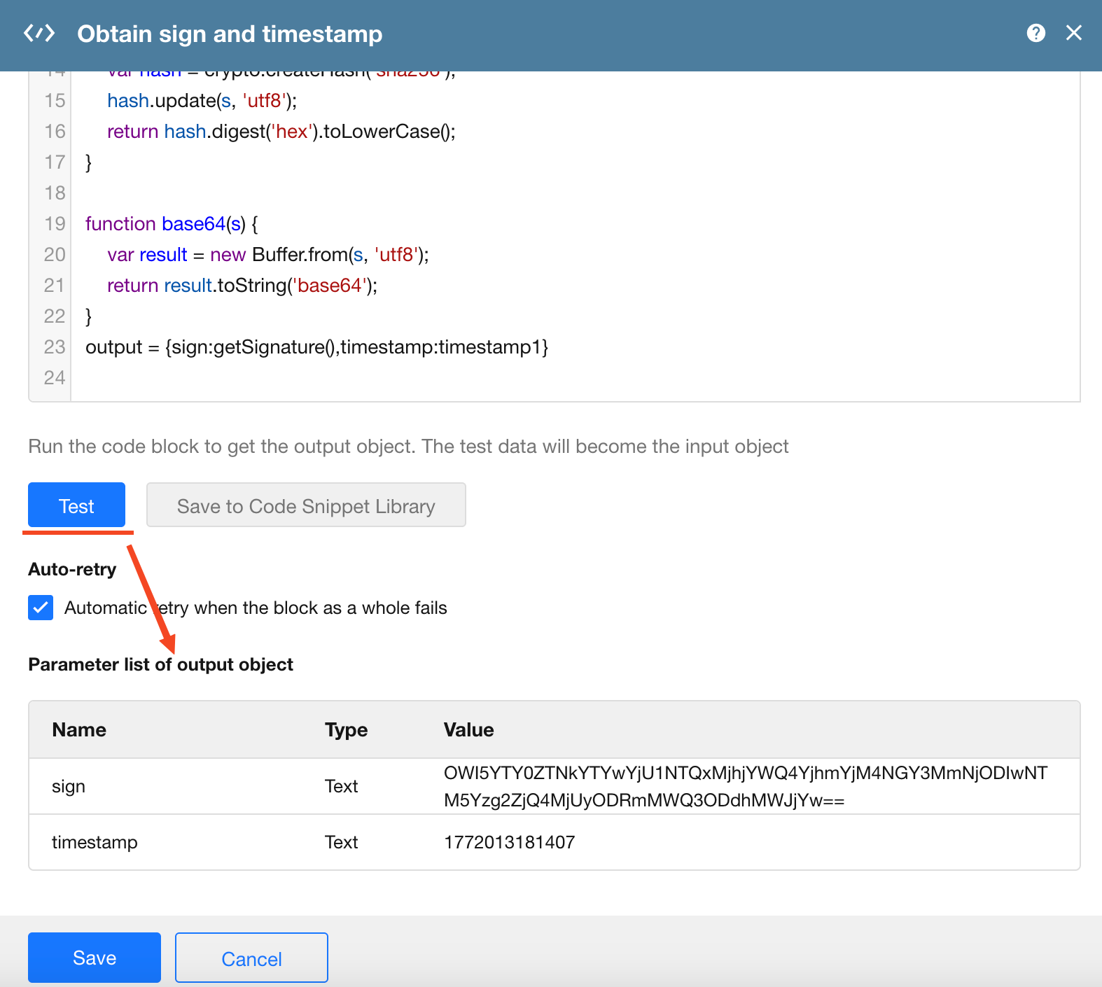 Click the Test button in the Code Block node to output the generated sign and timestamp, then save the node configuration.