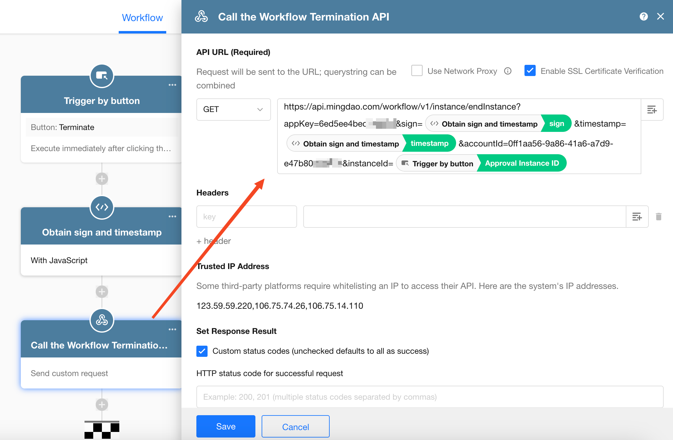 In the workflow associated with the “Terminate” button, add a Send API Request (custom) node and configure the request URL.