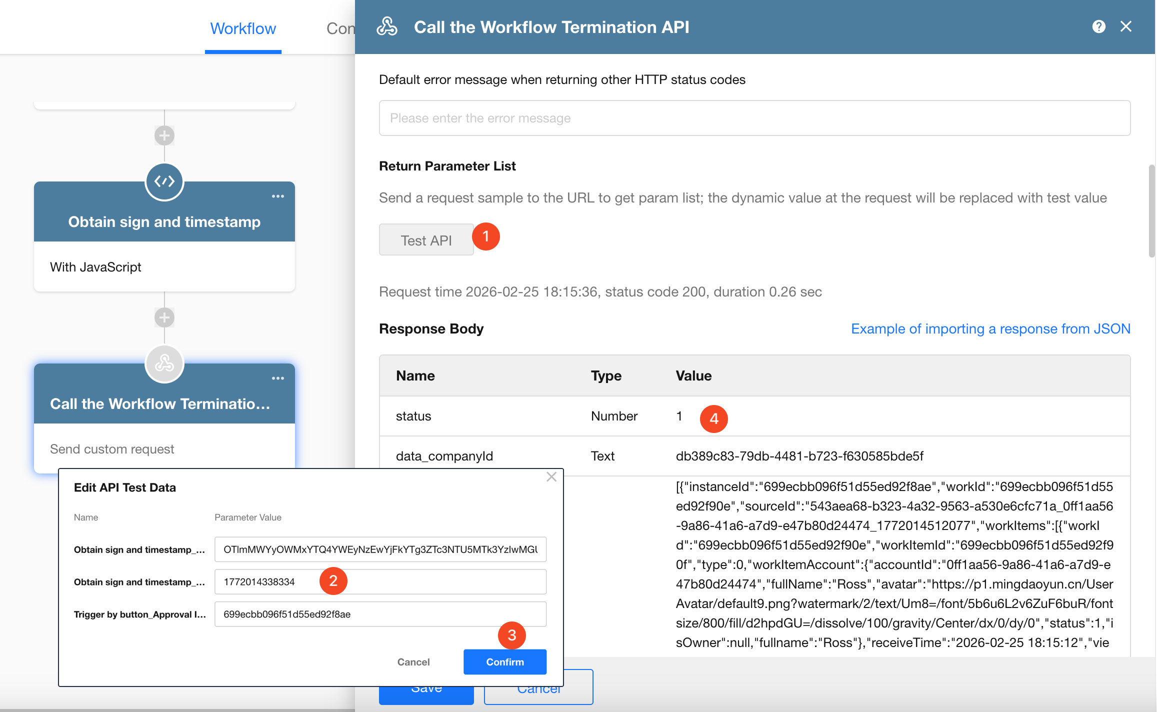 • As long as you obtain the instanceId, this API can terminate any workflow instance (not limited to approval workflows).