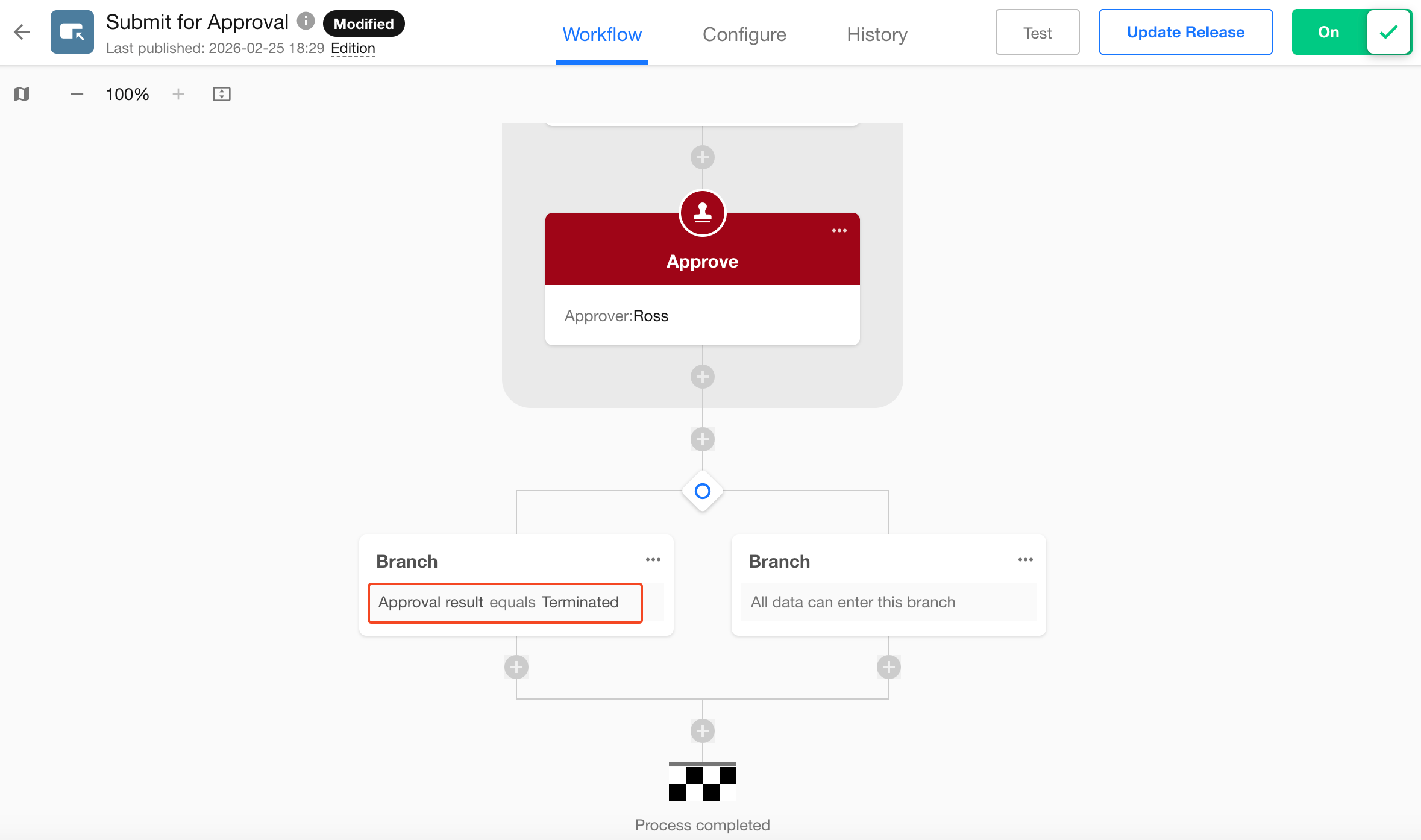 • After terminating an approval workflow, the main workflow can branch based on the approval workflow status.