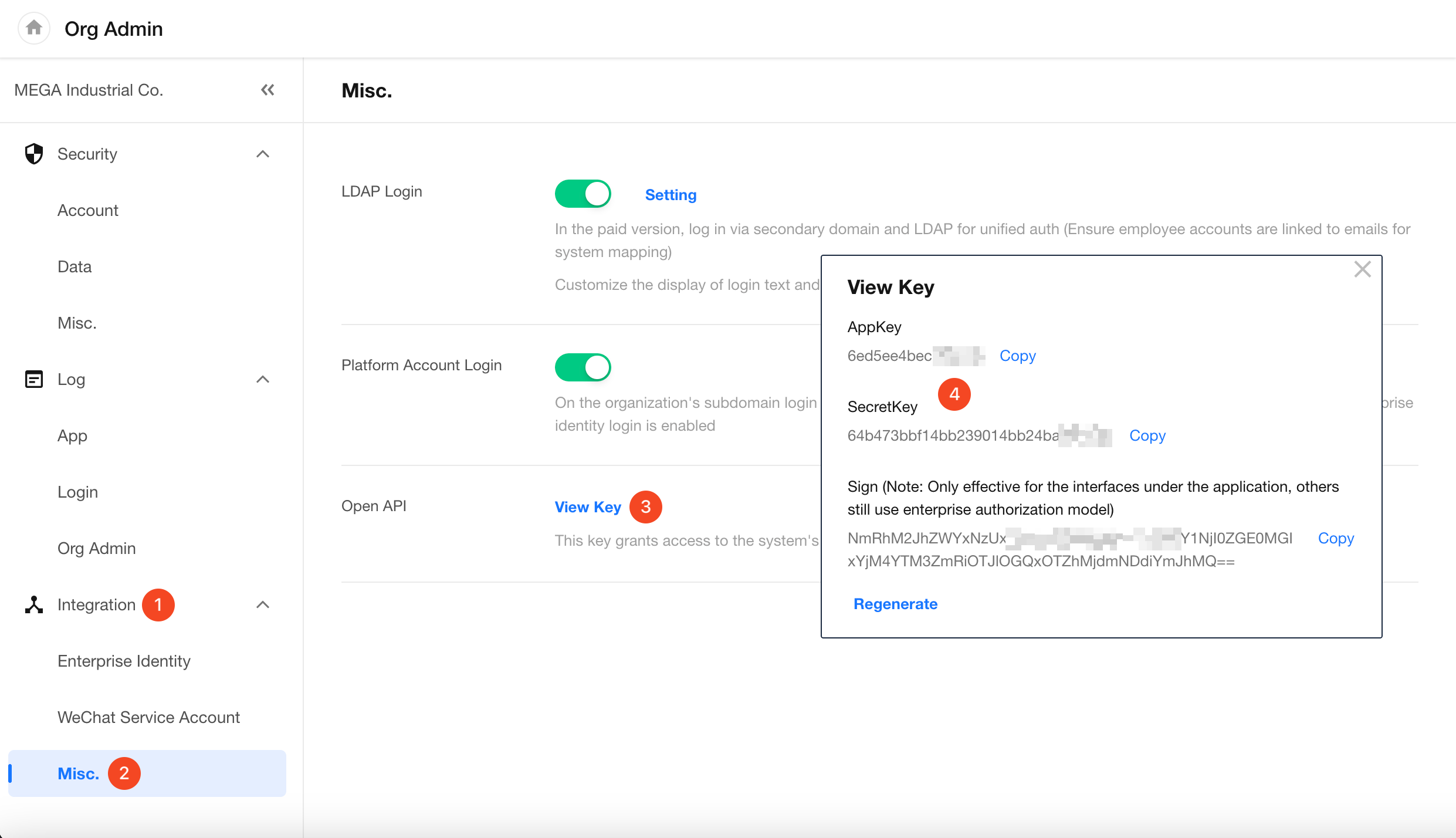 Organization administrators can go to the Organization Admin Console, then navigate to [Integration] > [Misc.] to view the organization’s key information, including AppKey and SecretKey.