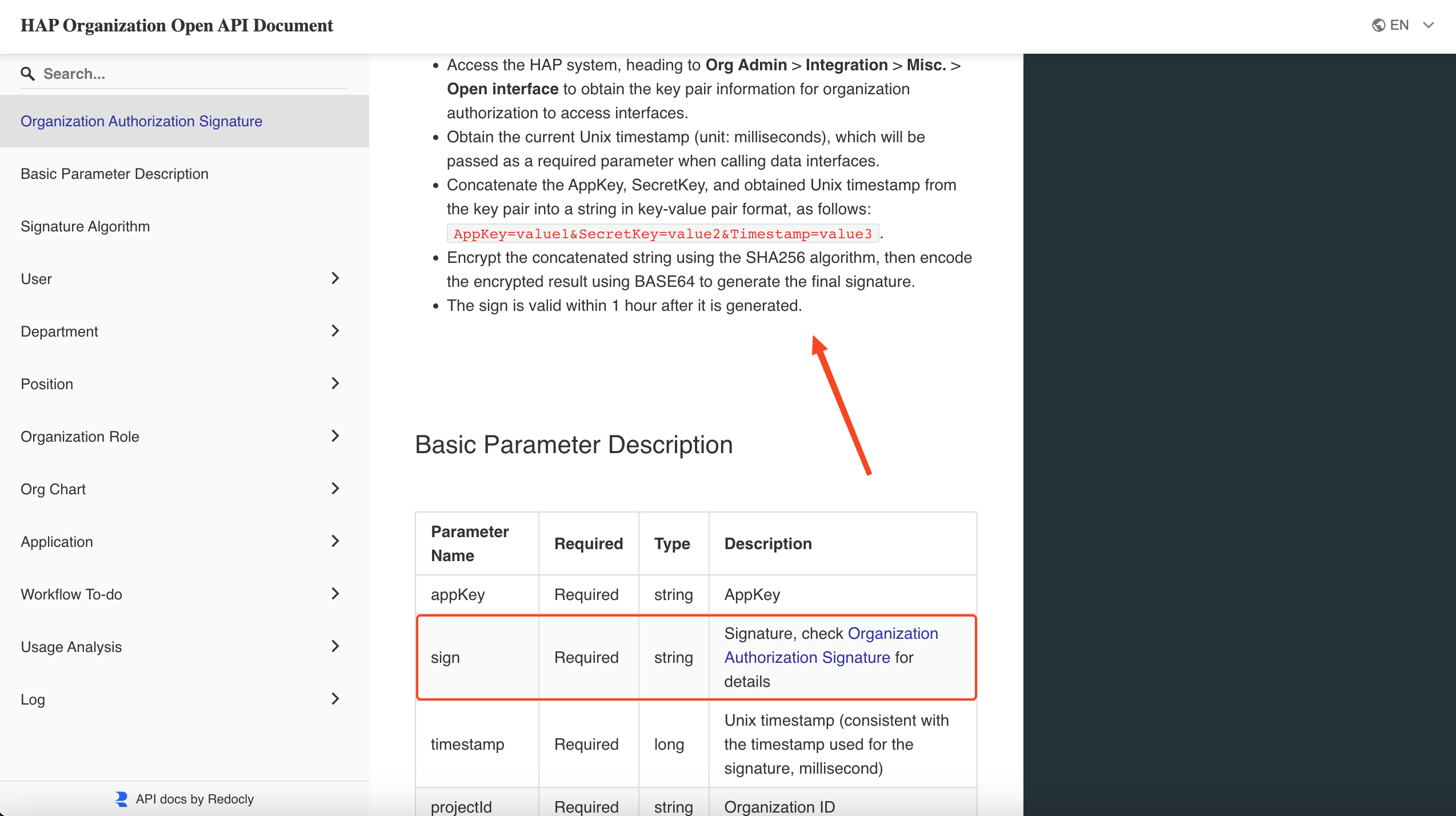 The API documentation explains how to generate the organization-level sign in the introduction section.