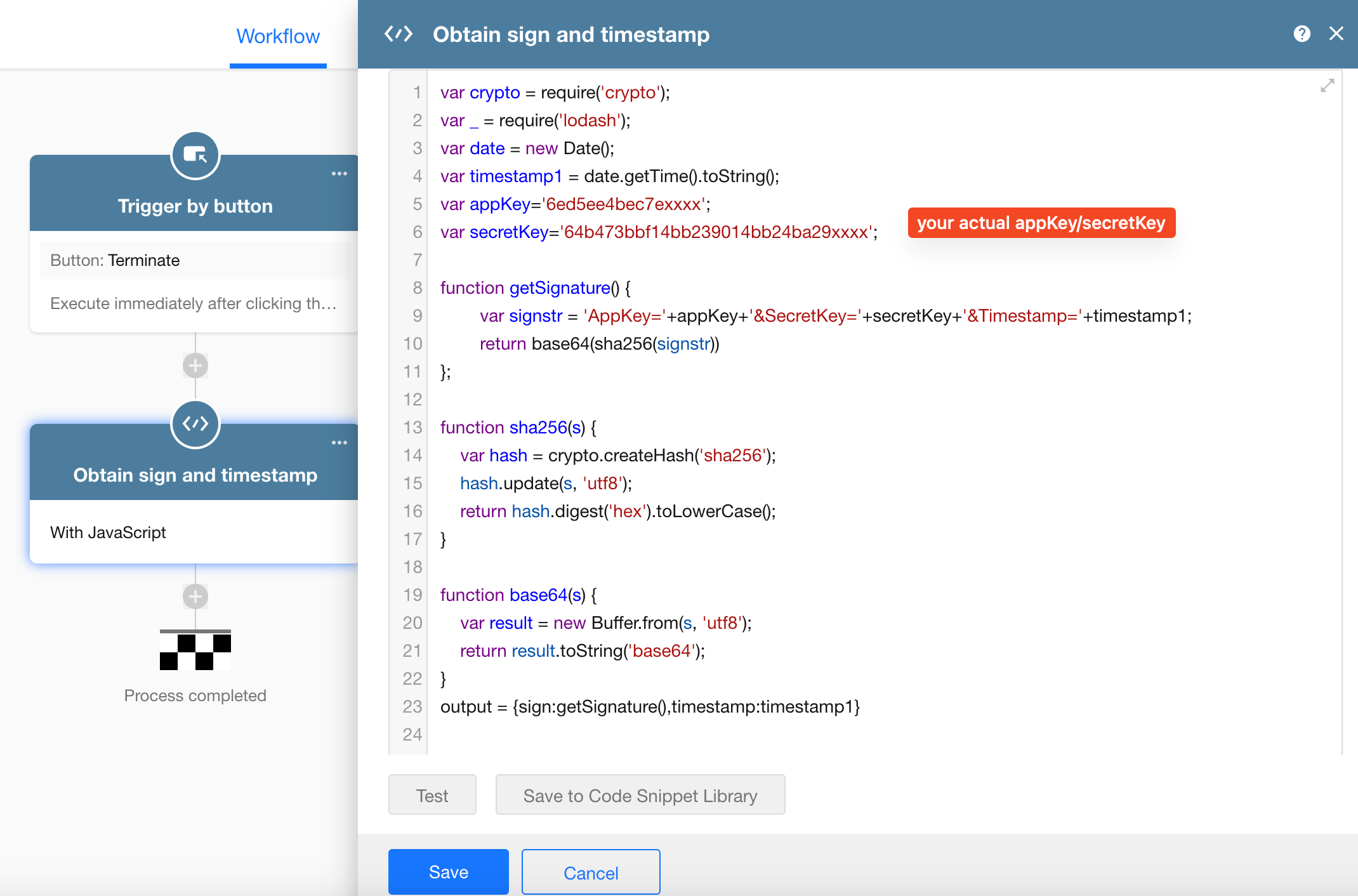 After the workflow starts, add a Code Block node to generate sign and timestamp based on the existing parameters.