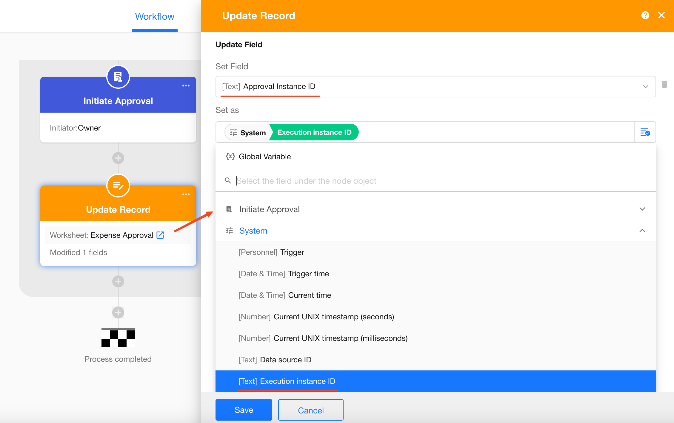 It is recommended to add an Update Record node immediately after the Initiate Approval Flow node, and write the current instanceId into a field in the record (e.g., “c”). This allows the value to be used later when calling the workflow termination API.