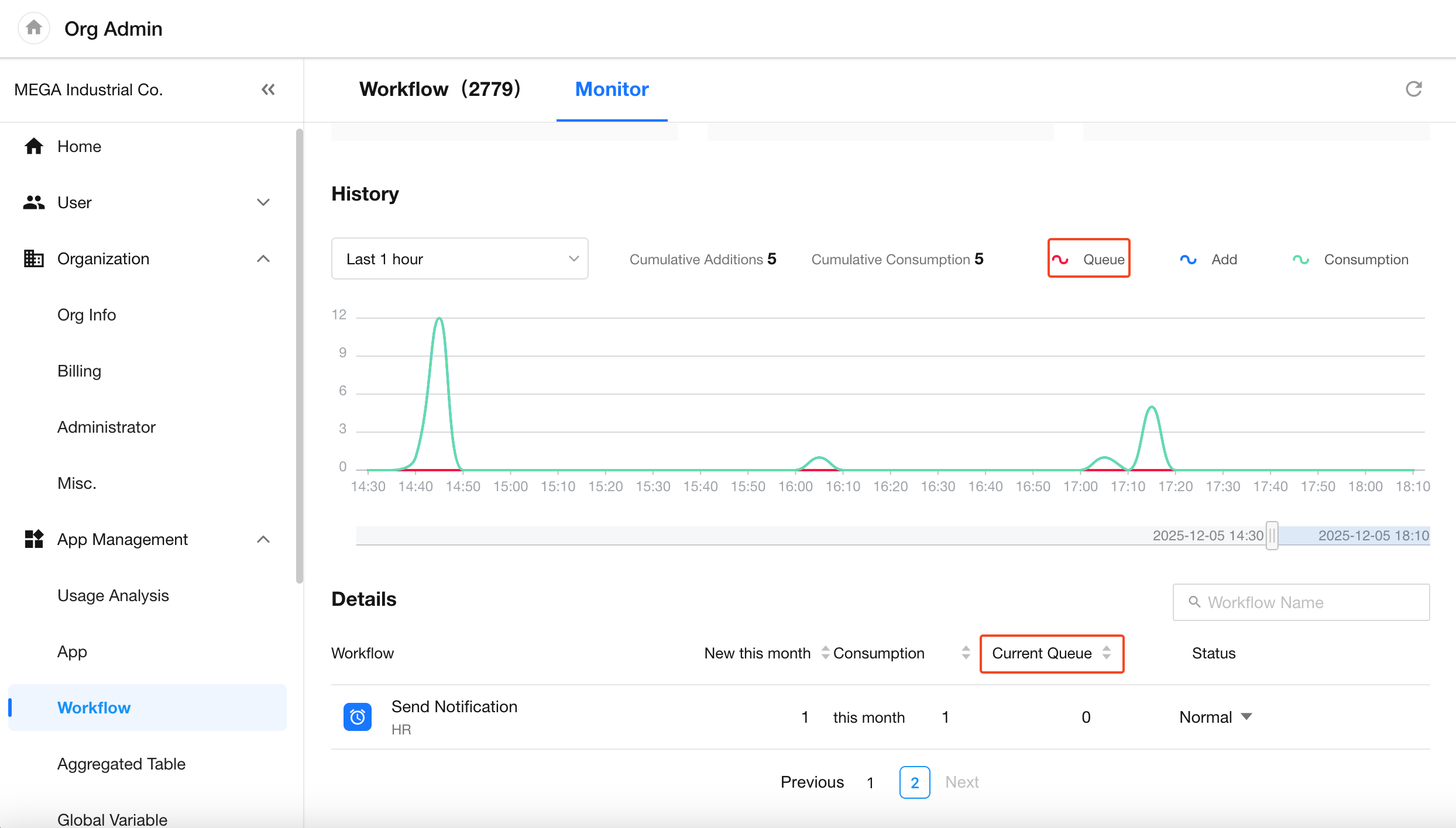 In the Workflow Execution History page and the Workflow Monitoring page in the organization console, you may see a number of queued workflows. This indicates that some workflows have been triggered but are waiting in queue before execution.