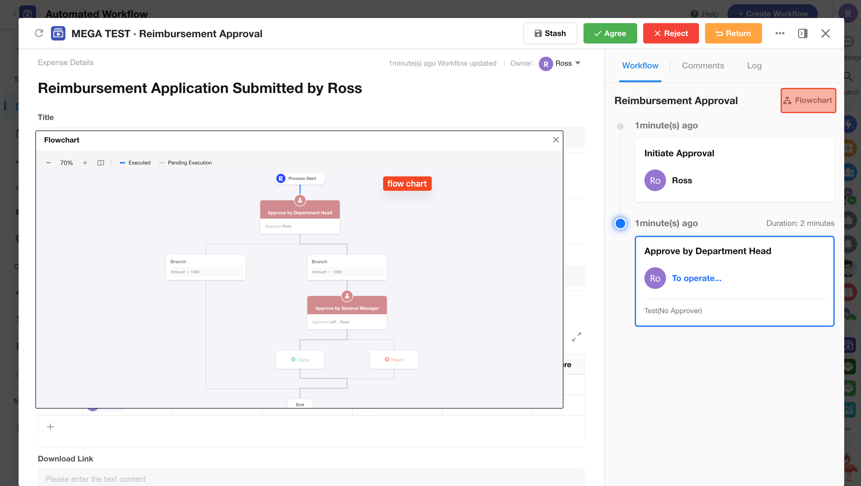 Use Case: When an applicant submits a reimbursement request, for amounts under RMB 1000, only the department head's approval is necessary. However, for amounts equal to or exceeding RMB 1000, the approval of the general manager is also required. Once the request is approved, a notification is sent to the applicant's direct supervisor.