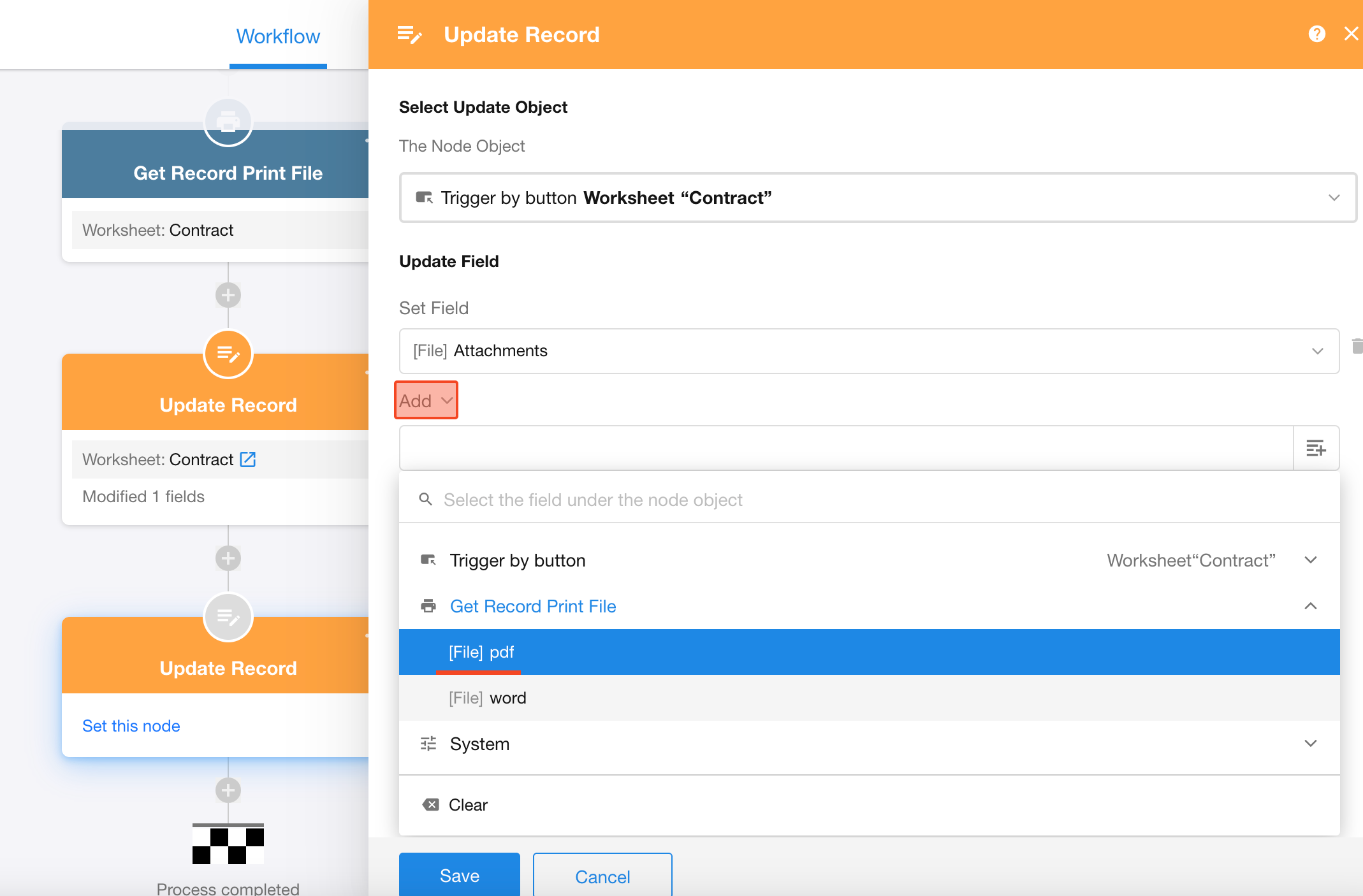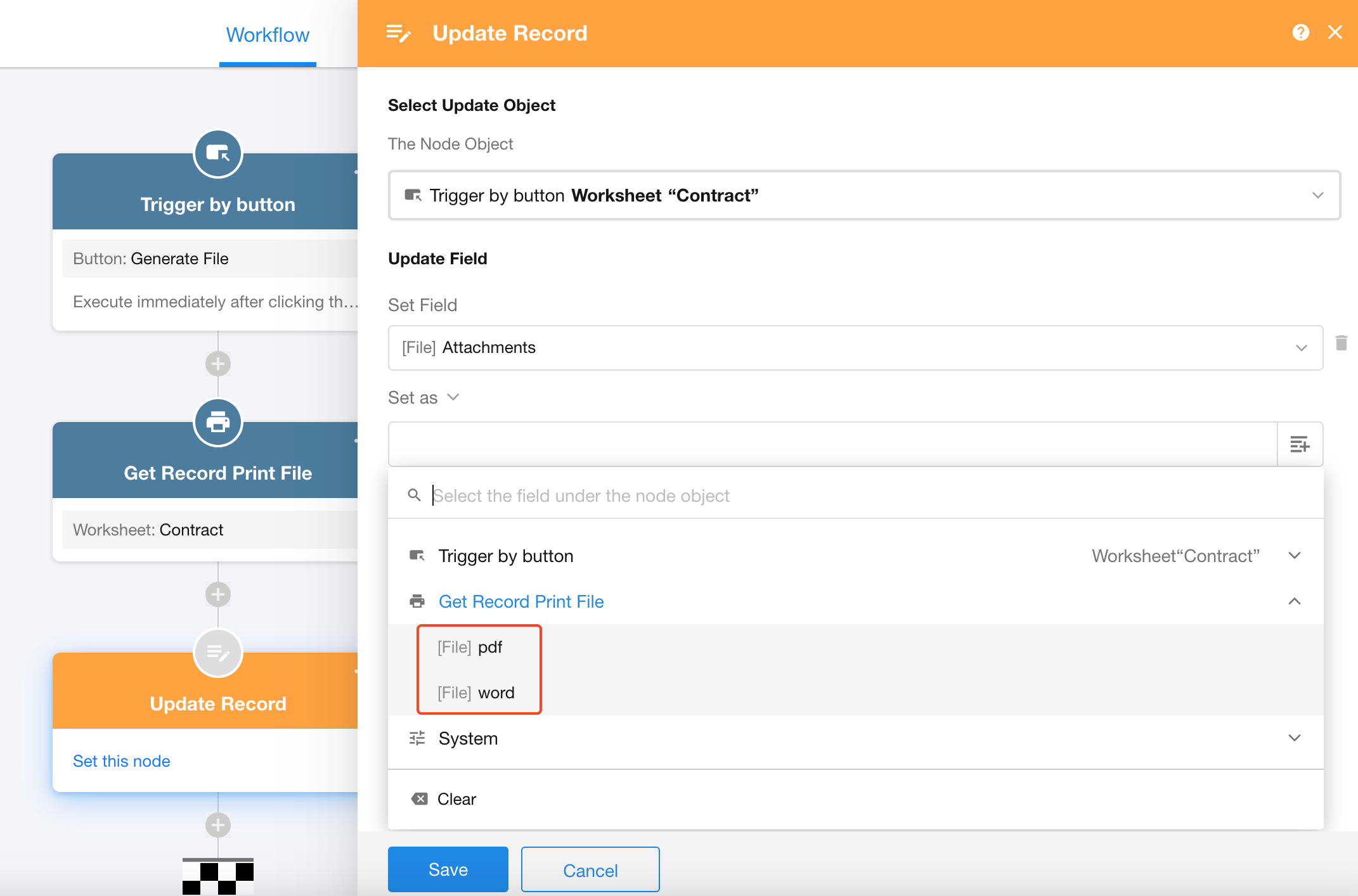 In a single "Update Record" node, only one file type (Word/Excel or PDF) can be selected.