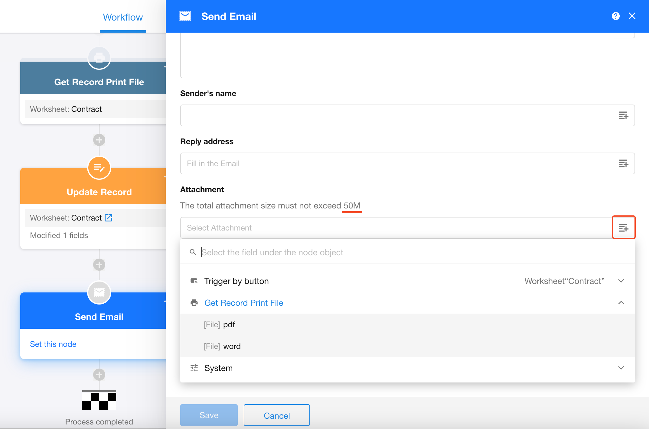 Automatically generate a contract document from a record using a Word template, save it to the record's attachment field, and forward it to Finance and Legal teams for review.