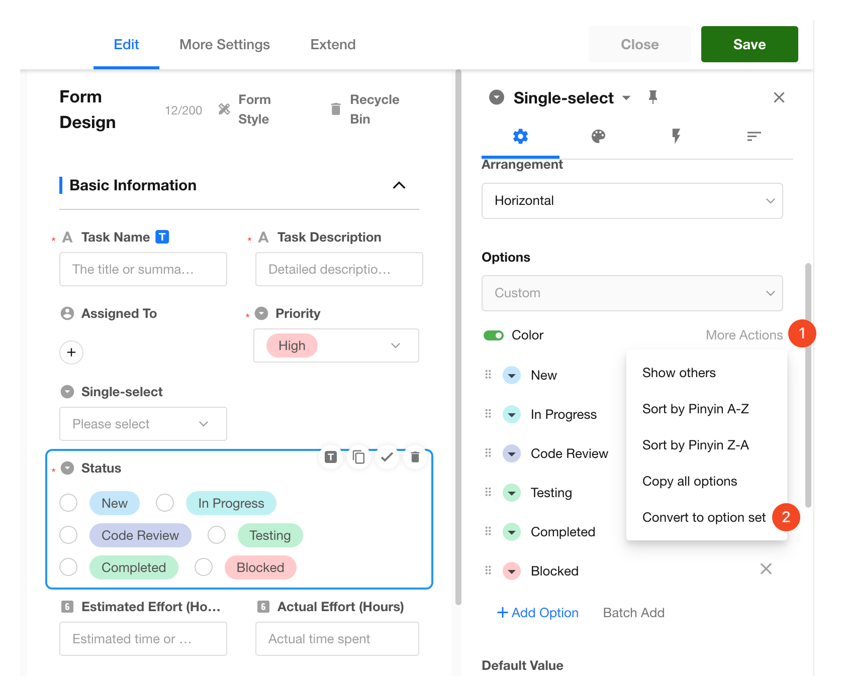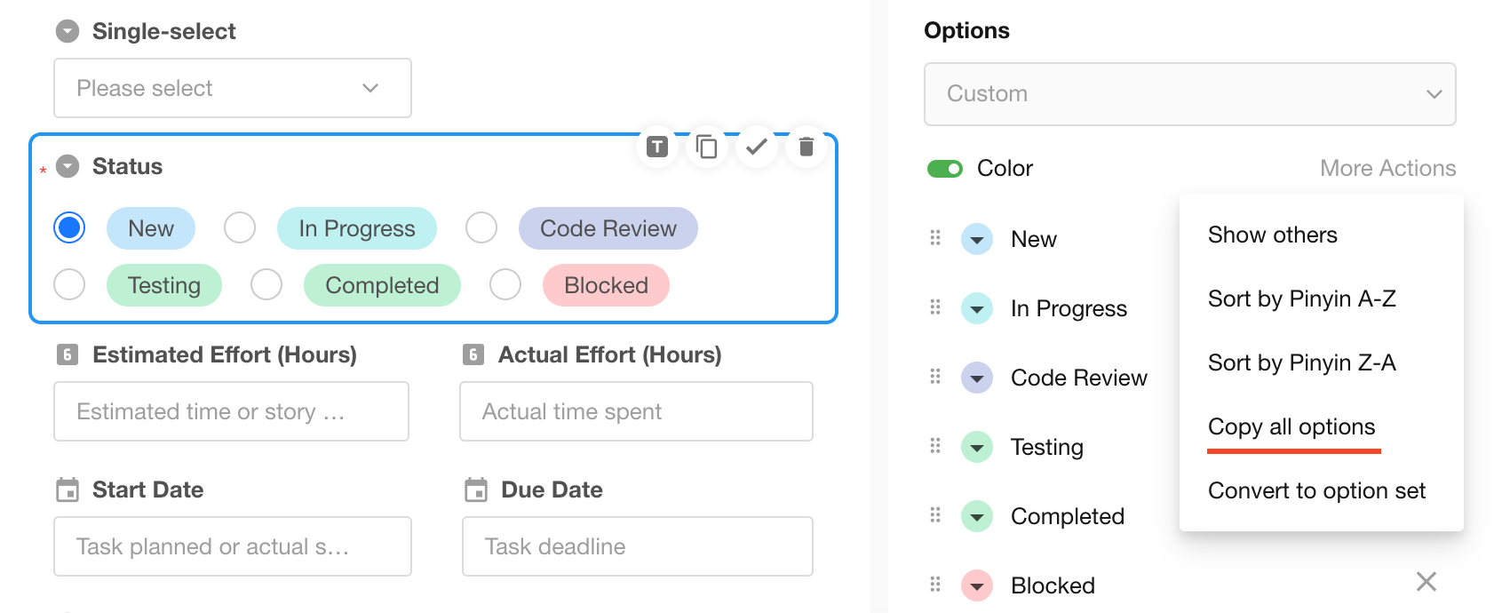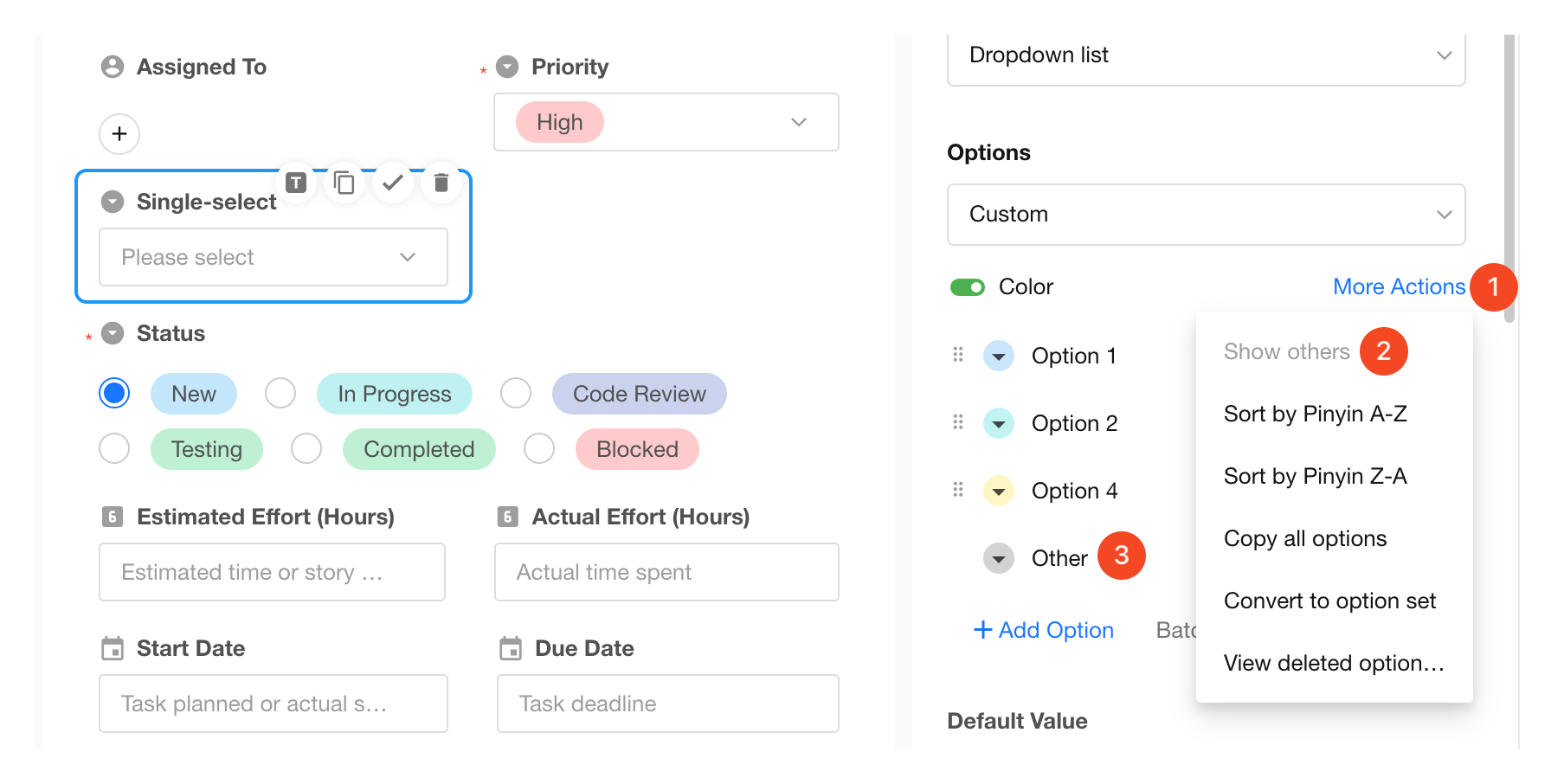 In the option list, you can drag and drop individual options to reorder them. In More Actions, you can also sort all options quickly by pinyin.